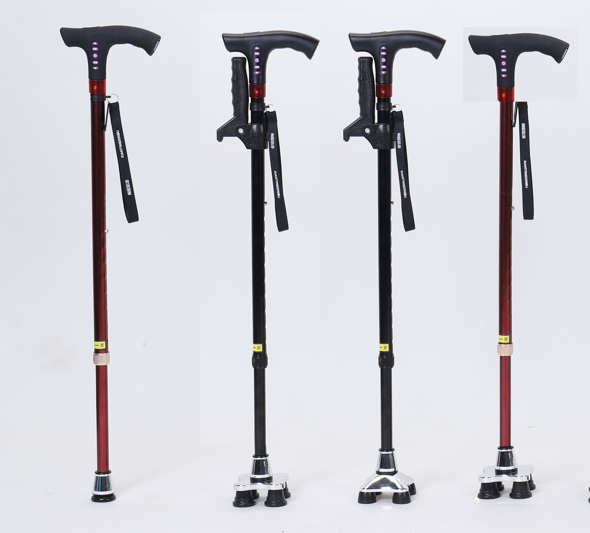 多功能智能老人拐杖LED照明报警收音机可伸缩老人四脚防滑铝合金