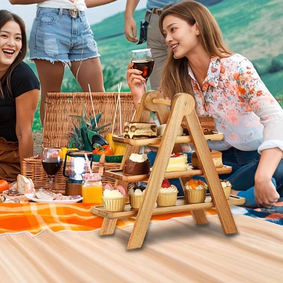 木製三段トレイケーキ・スナック陳列台、ポータブル食事用ディスプレイスタンド、フルーツ・スナック用無垢材三角スタンド