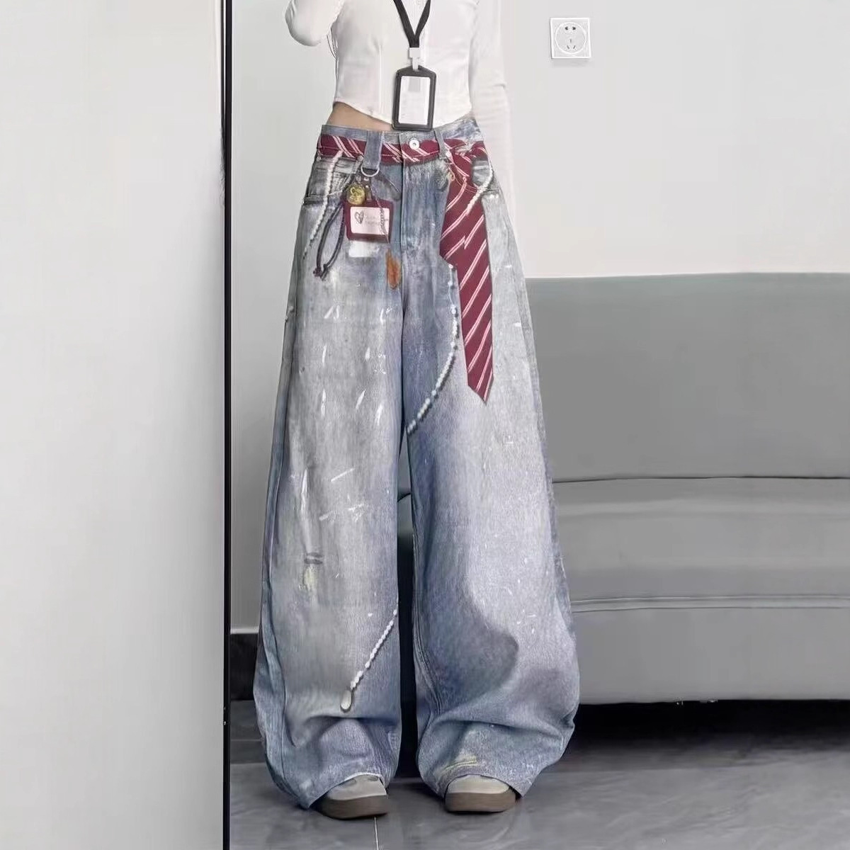 2025早秋新款链条吊坠领带泼墨水洗3D数码印花阔腿牛仔裤跨境外贸