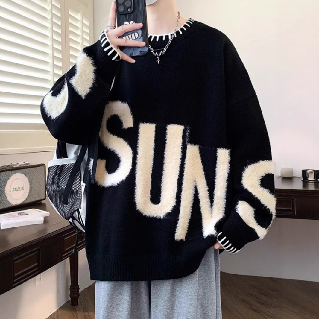 貂绒毛衣男秋冬季青少年慵懒风潮流宽松百搭休闲纯色针织衫