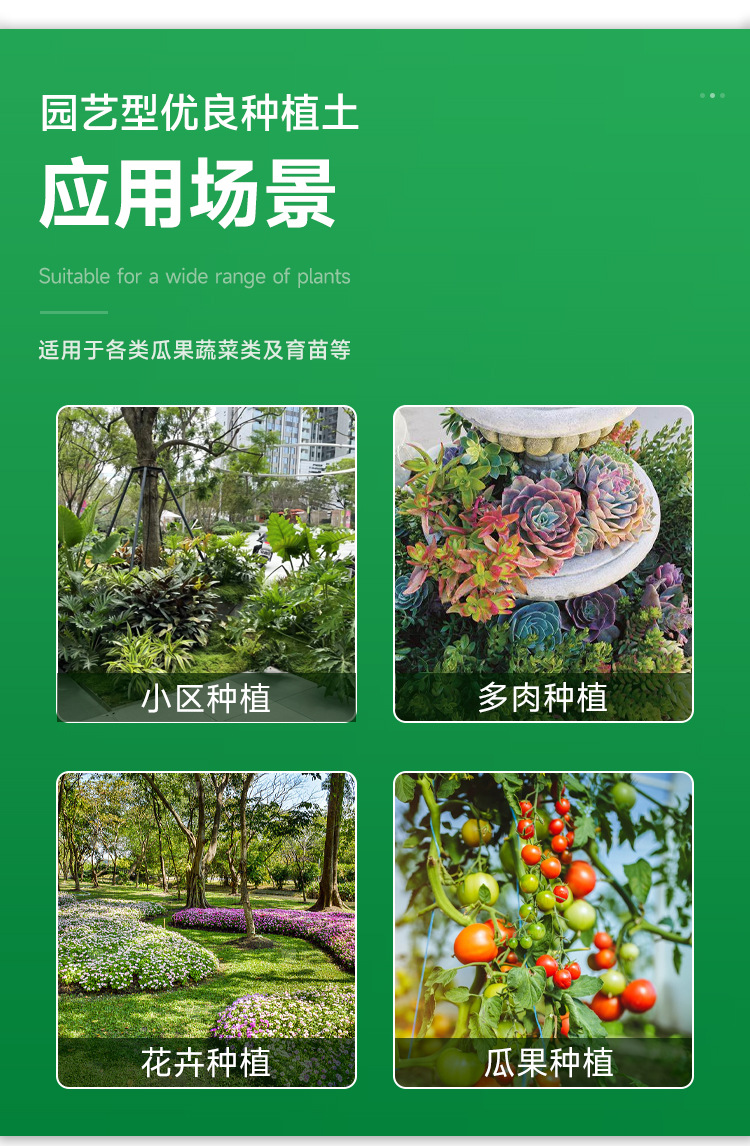 適用範囲 花、苗、苗、造園、野菜や花の栽培、基質植栽、都市土木、私園、土壌改良など。