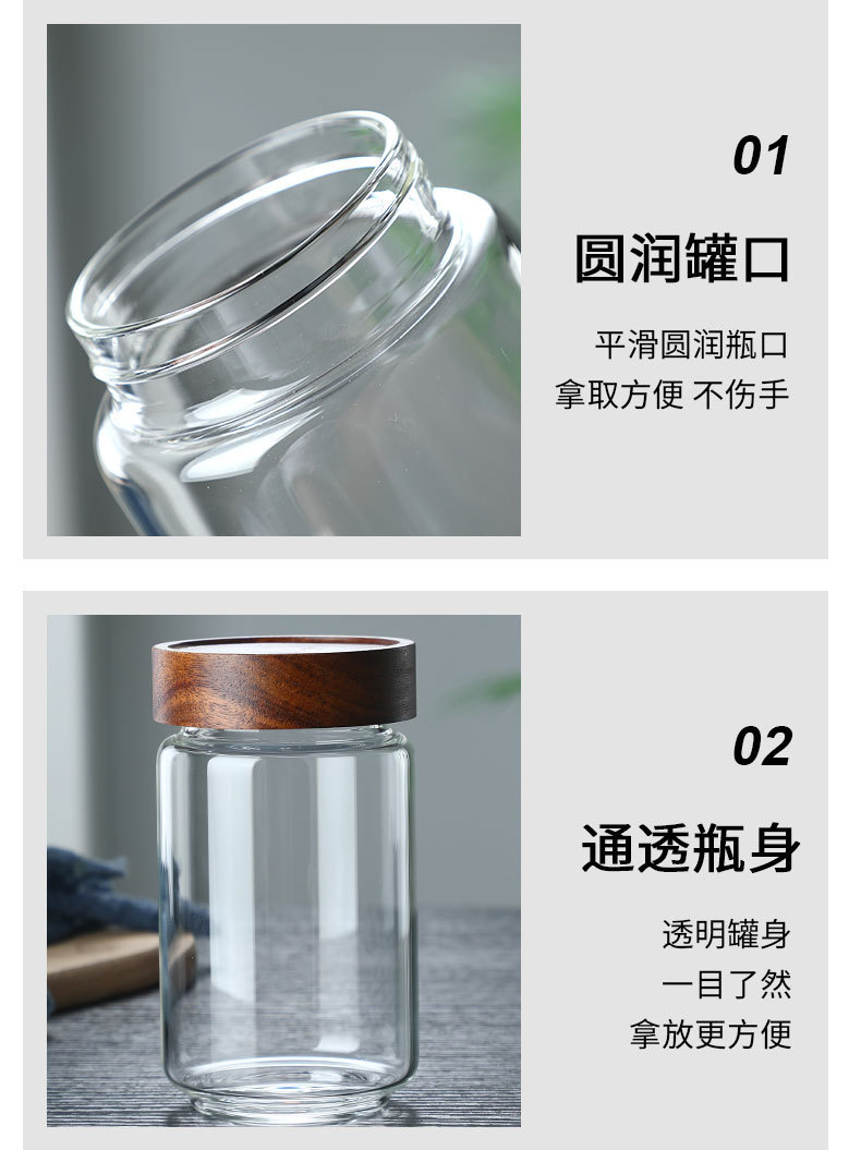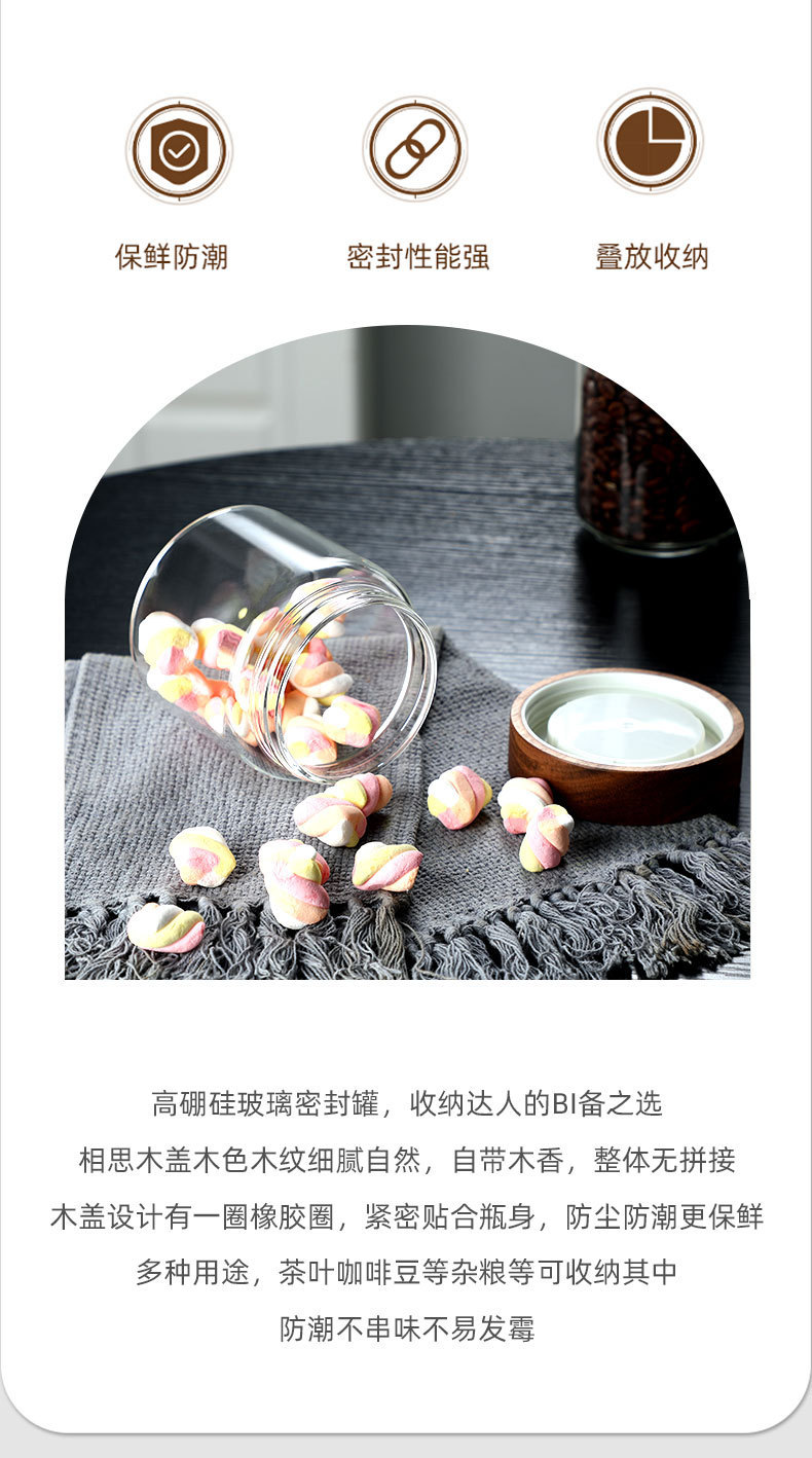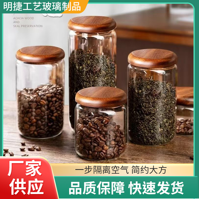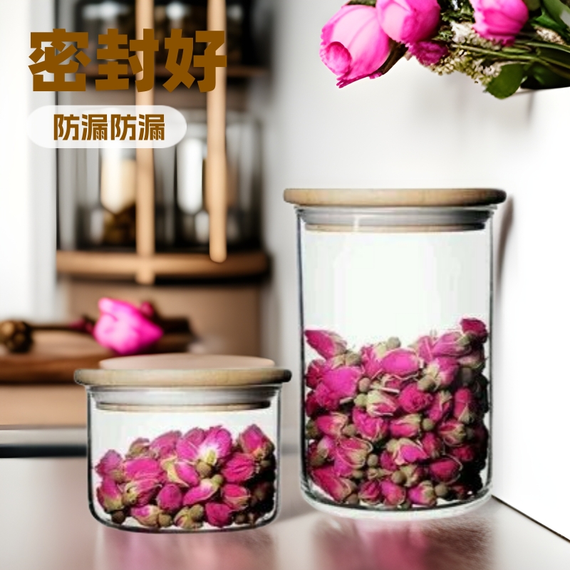 越境販売用防塵保存瓶卸売 高硼珪酸ガラス製花茶保存瓶 アカシア材蓋付き密封瓶 防湿