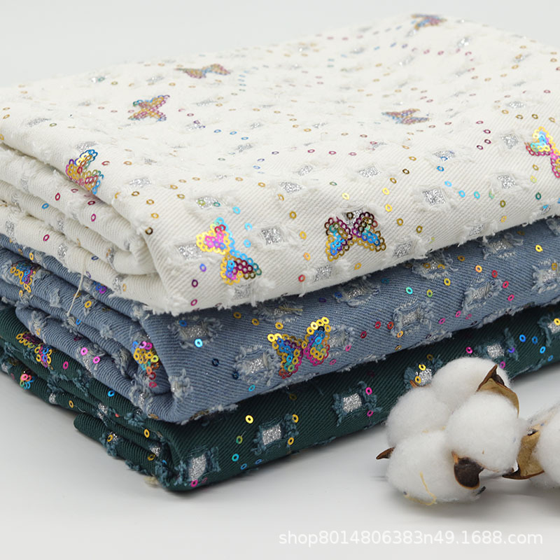メーカーの卸売りの七色の蝶のビーズの刺繍の水洗いのデニムの布地の服装の布地の厚い金の弾がない箱の布地