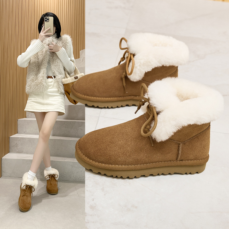 女性のための小さいサイズの本革スノーブーツ 2025 秋厚底滑り止めスリッポンリアルファーショートブーツカジュアルスノーコットン