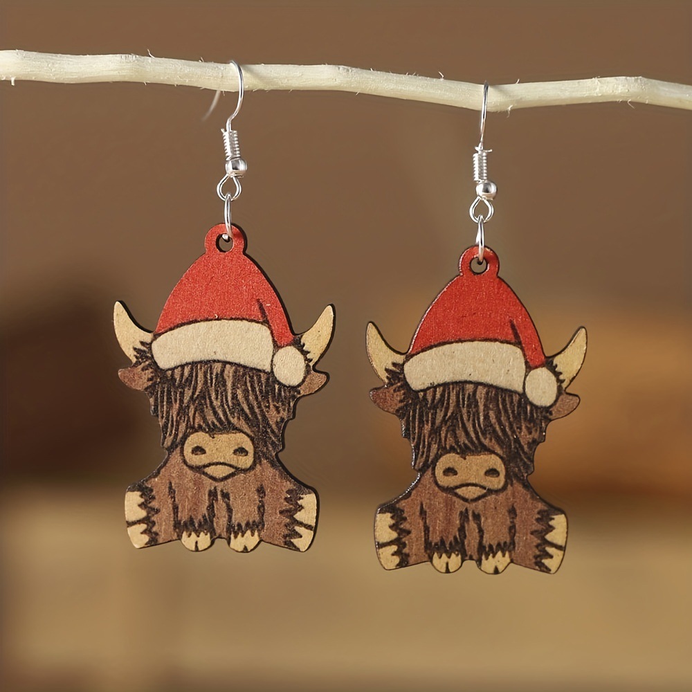 クリスマス帽子高山牛デザイン斜めイヤリングレトロかわいいスタイル木制ジュエリークリスマス耳饰り