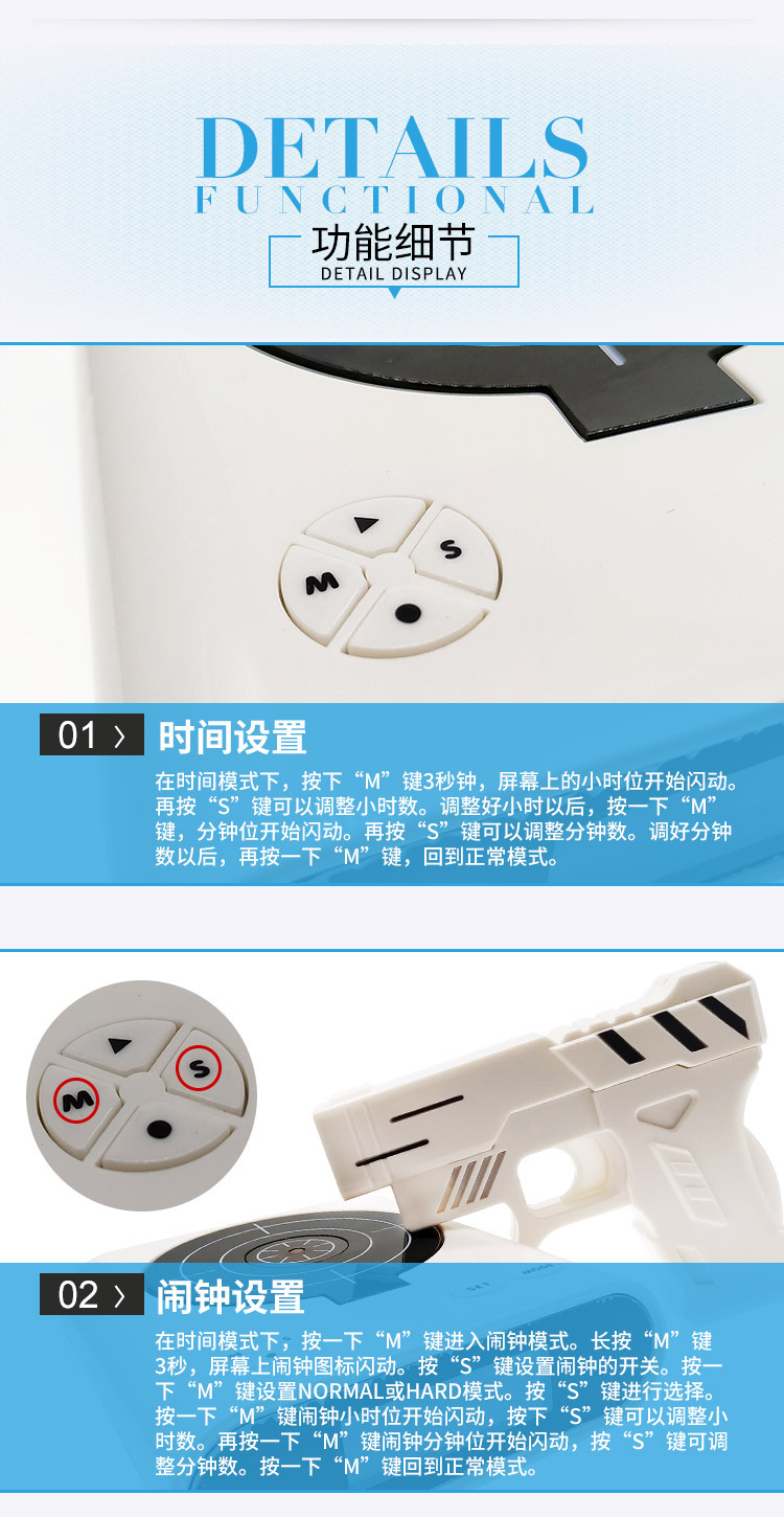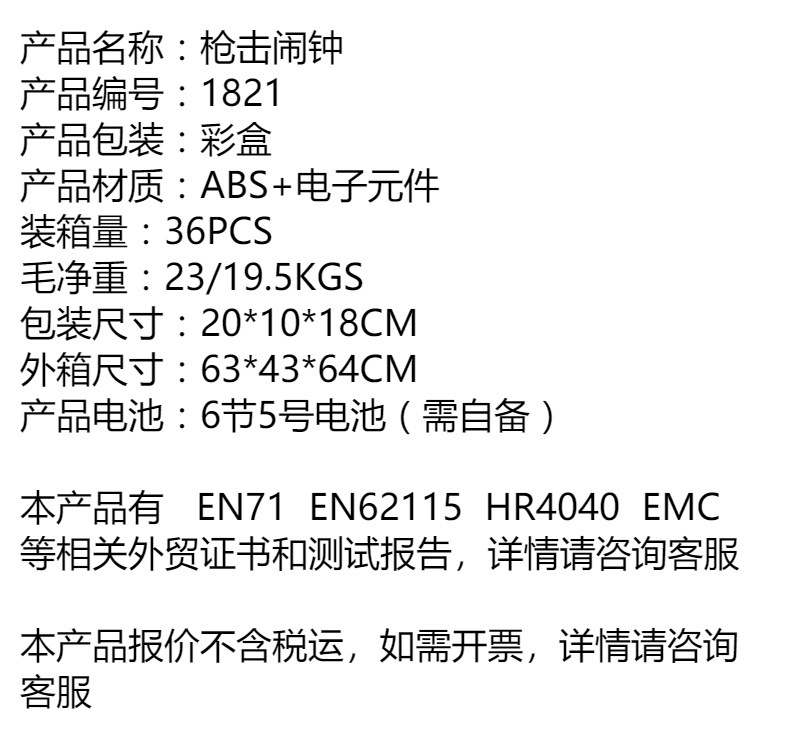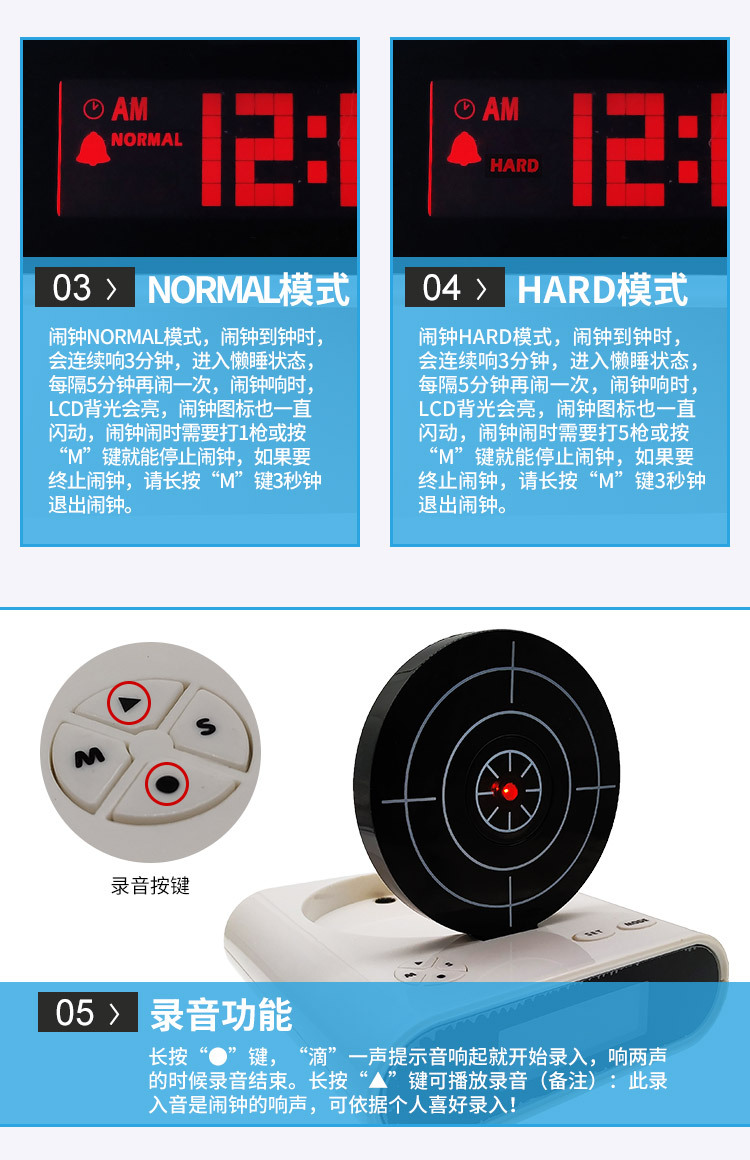 电池款打靶闹钟;闹钟电池4节5号电池,手枪2节5号电池