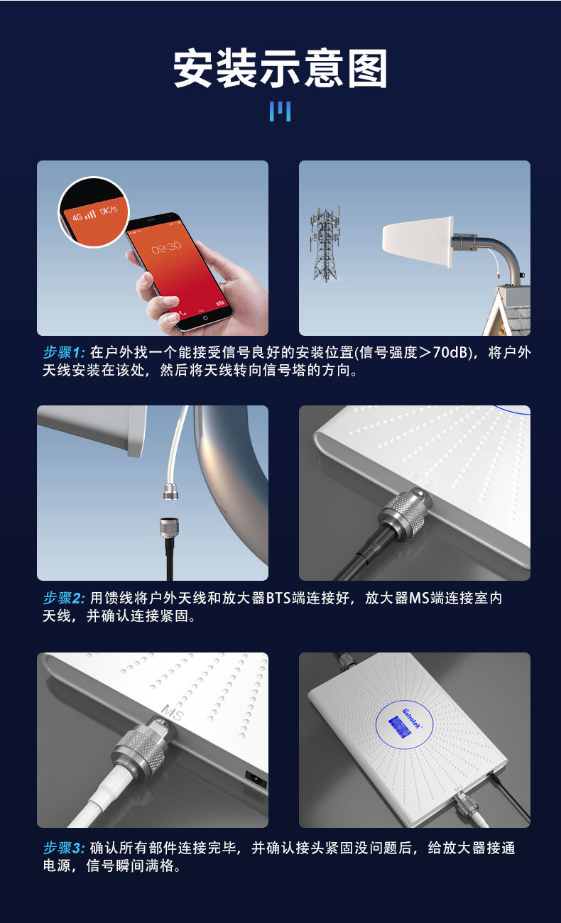 適用範囲 別荘コミュニティ、地下鉄、地下鉄トンネル、密集した都市部の村、その他のプロジェクト、家庭、屋内および屋外の携帯電話無信号環境、ワイヤレスネットワーク信号受信ブースター