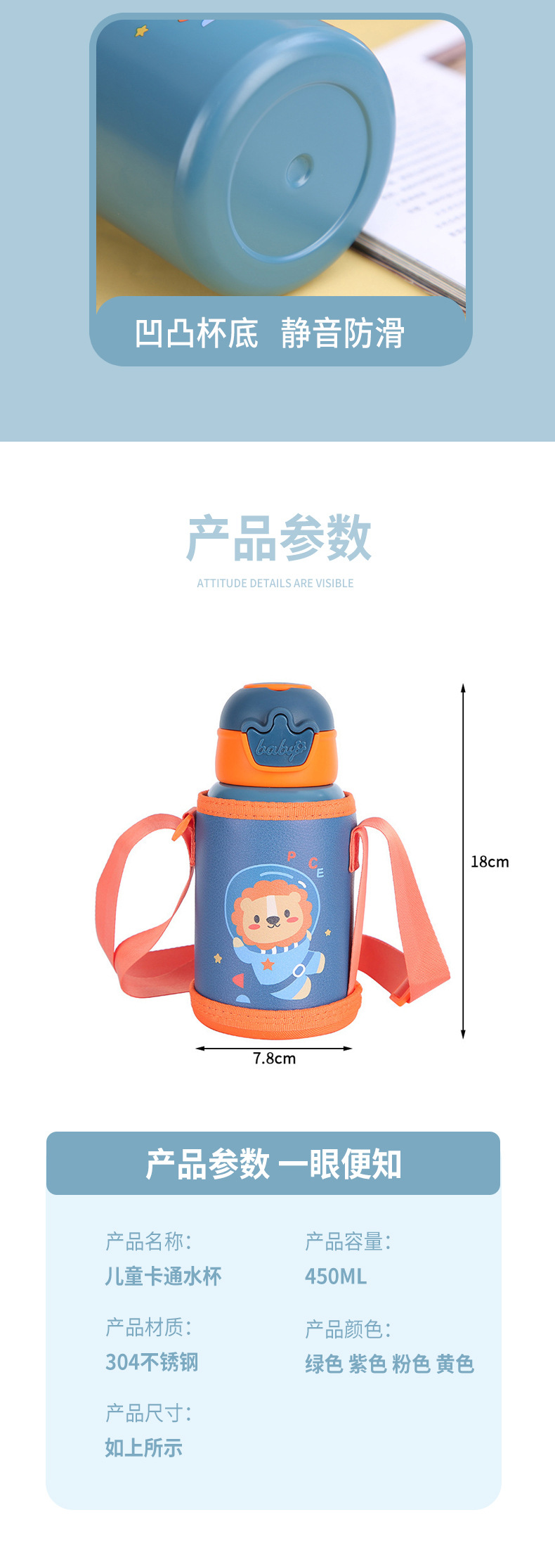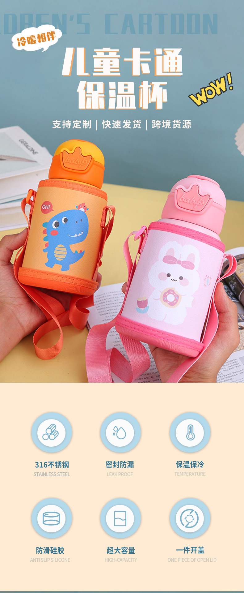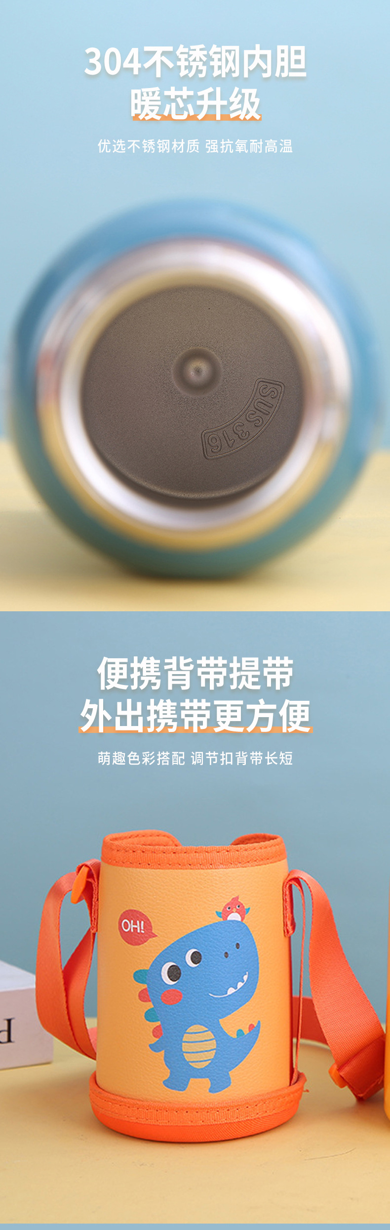 新款316不锈钢儿童保温杯高颜值便携卡通保温壶学生背带吸管水杯