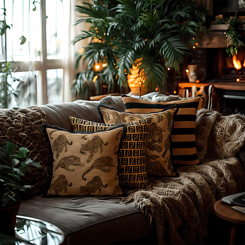 中古复古风三色咖绿白虎山纹色织提花雪尼尔软糯沙发抱枕布面料