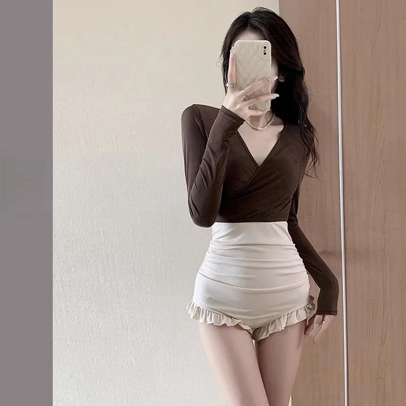 欧洲站咖啡色法式复古名媛风单肩贵气高级感连体温泉海边泳衣女