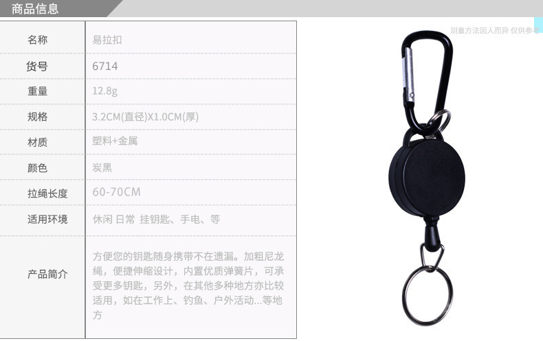 YLKO イージーロープキーホルダー アウトドアロープ引き手 登山用カラビナ スチールワイヤーロープ 伸縮式ロープ収納バックル