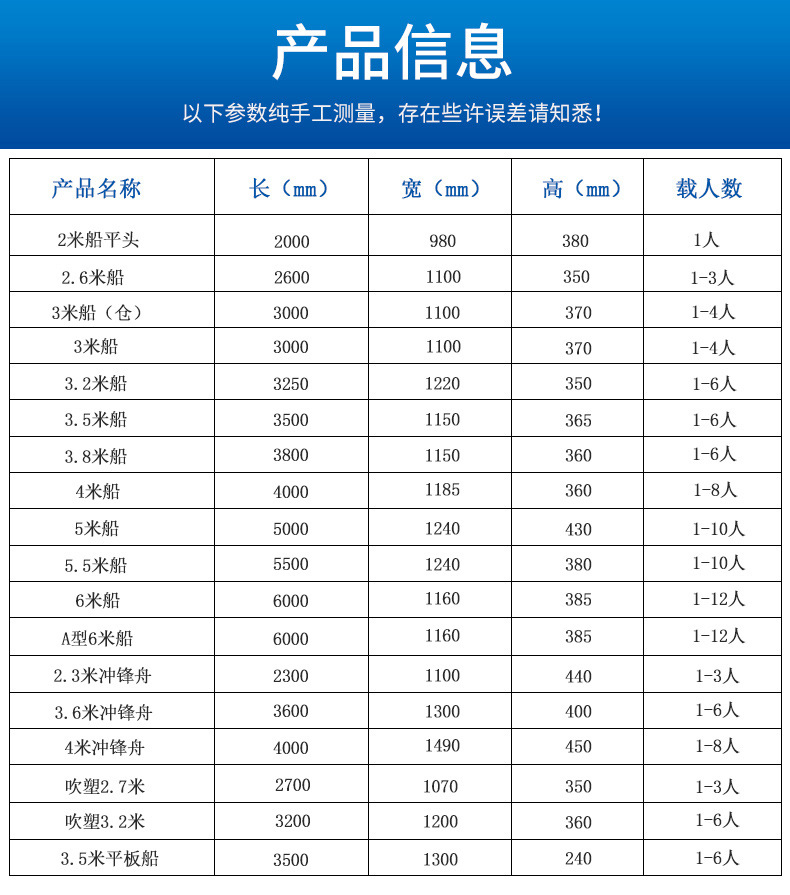 新料2メートルボート2倉版 (1人載せることができる),新材料の2.3メートルの幅には活水倉がある (積載可能な1 ~ 2人),新材料の先の2.5メートルの幅に活水倉があります。,新材料平頭2.6メートル幅 (積載可能1 ~ 3人),新材料平頭2.8メートル幅に活水倉 (積載可能1 ~ 3人) がある,新材料平頭3メートル幅 (積載可能1 ~ 4人),新材料平頭3.2メートル幅に活水倉 (積載可能1 ~ 5人) がある,新材料のダブルヘッド3.2メートル幅 (積載可能1 ~ 4人),新材料のダブルヘッド3.5メートル幅 (積載可能1 ~ 5人),新材料平頭3.6メートルとブロードバンド活水倉 (積載可能1 ~ 7人),新材料の両頭の幅は3.8メートル (積載可能1 ~ 7人),新材料平頭4メートルとブロードバンド活水倉 (積載可能1 ~ 8人),新材料のダブルヘッド4メートル幅 (積載可能1 ~ 8人),新材料平頭5メートル幅拡大帯活水倉 (積載可能1-10人),新材料のダブルヘッド5.5メートルの幅を広げて高さを上げる (積載可能な積載量は1 ~ 12人),新材料のダブルヘッドは6メートル幅を広げて高さを上げる (積載可能な積載量は1 ~ 15人),新材料の双頭ブローは2.7メートルで幅を広げます。,新材料のダブルヘッドのブロー成形は3.2メートルの幅を広げます。,新材料平板船は3メートル幅を厚くする (積載可能な1 ~ 5人),新材料平板浮台3.2メートルの幅を厚くする (積載可能な1 ~ 5人) 人気モデル,新材料平板船は3.5メートル幅を厚くして (積載可能な1 ~ 6人) 人気金,新材料平板船4.2メートルの幅を厚くする (積載可能な1 ~ 8人),船外フックが必要です。,オレンジ色の突撃舟2.3メートルの幅を厚くして活水倉を持っている (積載可能な積載量は1 ~ 3人),オレンジ色の突撃舟3.1メートルの幅を厚くして活水倉を持っている (積載可能な積載量1 ~ 6人),オレンジ色の突撃舟は3.6メートル幅を伸ばして生きた水倉を厚くした (積載可能な1 ~ 8人)。,オレンジ色の突撃舟4メートルの幅を厚くして生きた水倉を持っている (積載可能な積載量は1 ~ 10人),航凱2P3.5ストロークガソリンモーター (モーターを送るスタンド) は返品しないだけです,航凱2P6打撃モーター (モーターを送るブラケット) は交換しないだけです。,航凱ET65電動モーター (モーターを送るブラケット) は電池を交換しないで購入します (12V),3 ~ 3.5メートルの平板船のモータースタンド,4.2メートルの平板の船のモーターの支柱,一般的なプラスチック船モーターブラケット