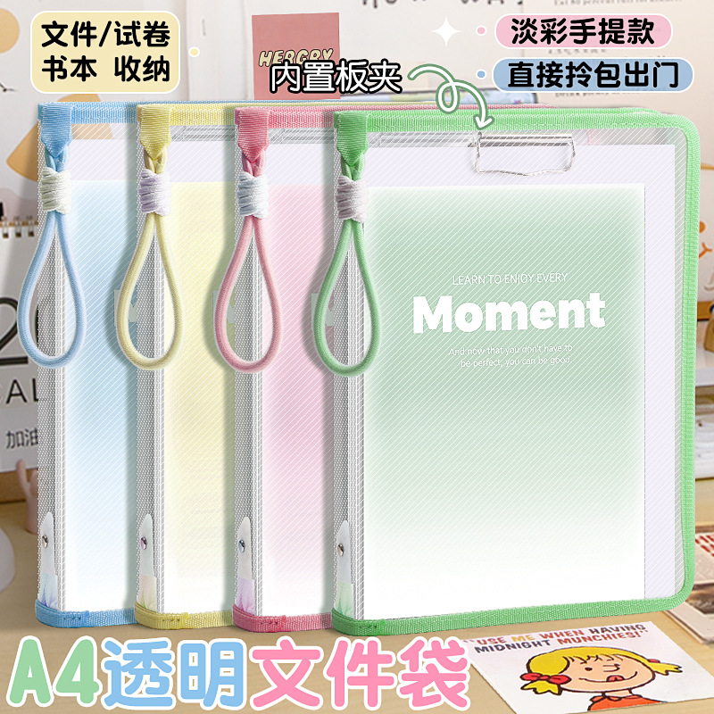 文谷拉链手提袋学生文件袋糖果透明手提包A4大容量试卷课本收纳袋