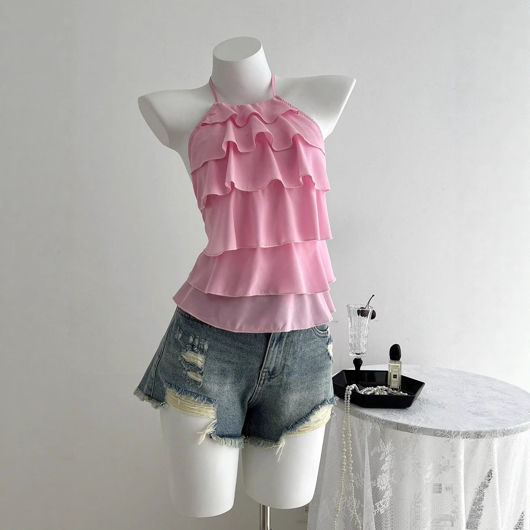 夏の新しい女性の無地ホルターネックノースリーブバックレスリボンスタック装飾ステッチニッチレースアップトップ