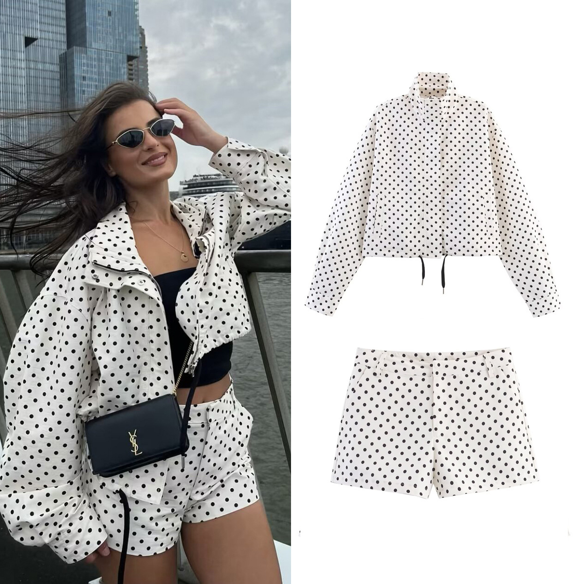 跨境外贸女装2025秋欧美风立领长袖撞色波点抽绳夹克外套女B88865
