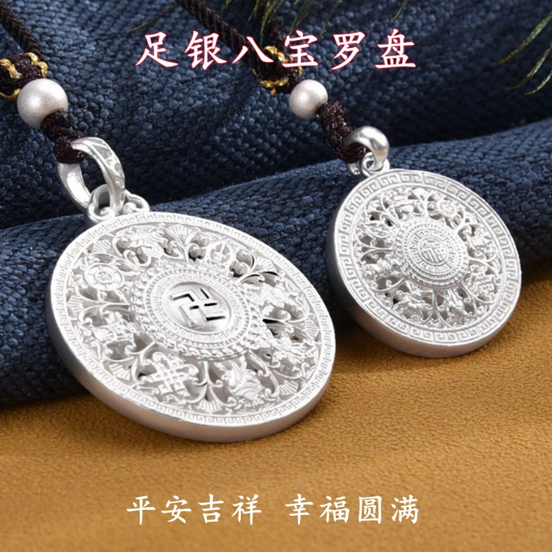 999足銀八宝コンパスペンダント男女福字吉言透かし彫り蓮純銀編み縄ネックレス吉祥ペンダント