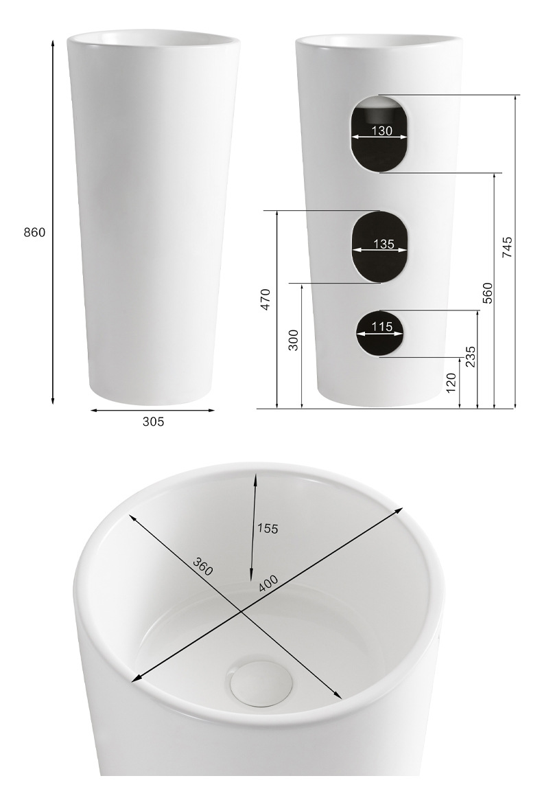 メーカー製セラミック一体型床置き式円柱型洗面器、自立型丸型洗面器、浴室・ベランダ用洗面器