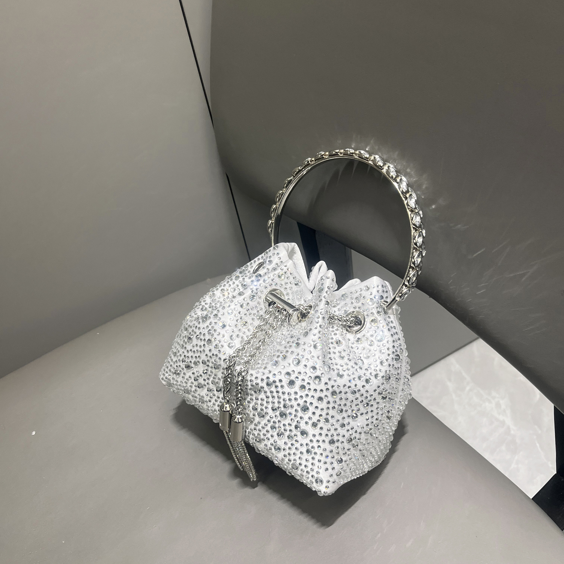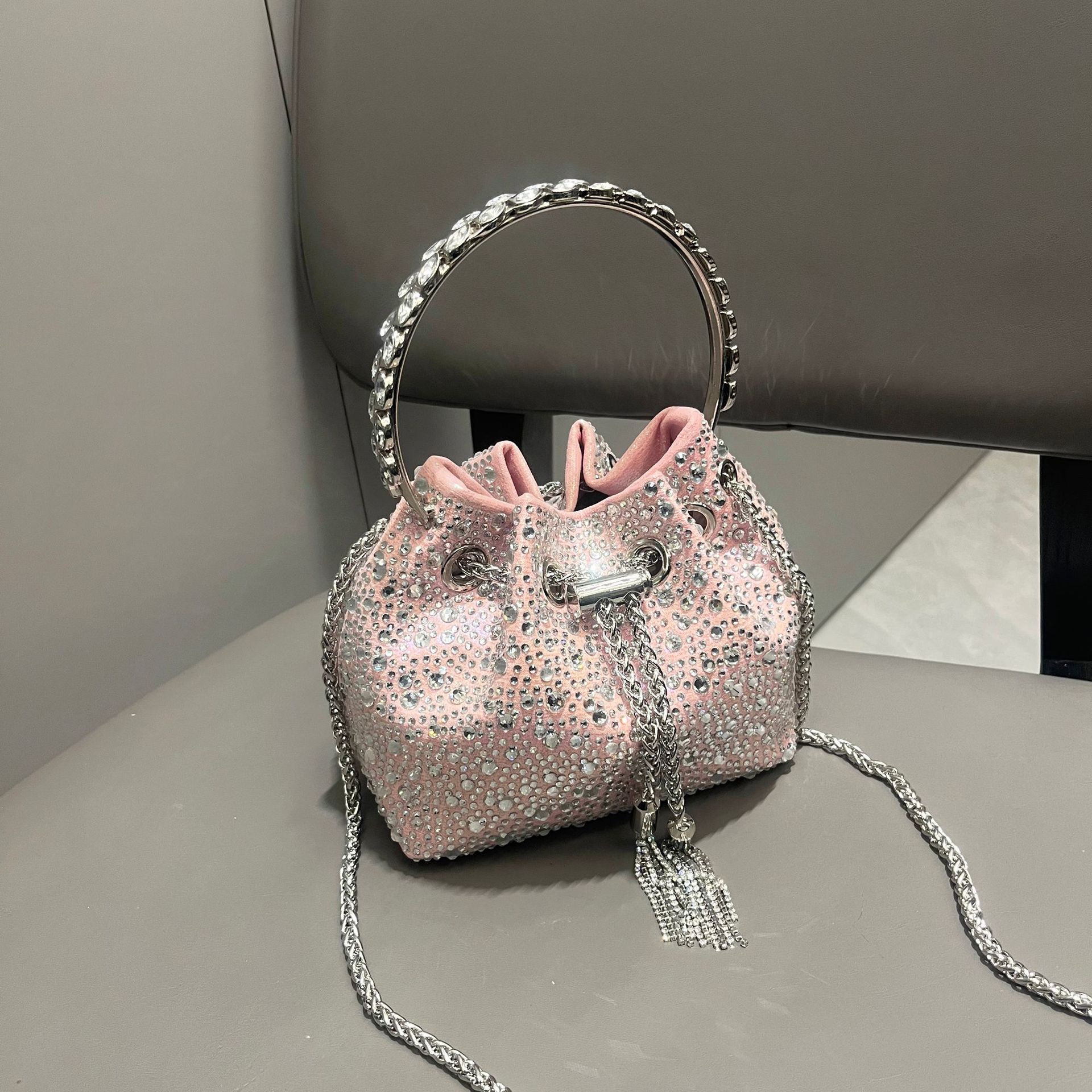 ヨーロッパとアメリカの貿易クロスボーダーレディースバッグ、グラデーションタッセルバケットバッグ、ポータブルラインストーンバッグ、シングルショルダークロスボディイブニングバッグ