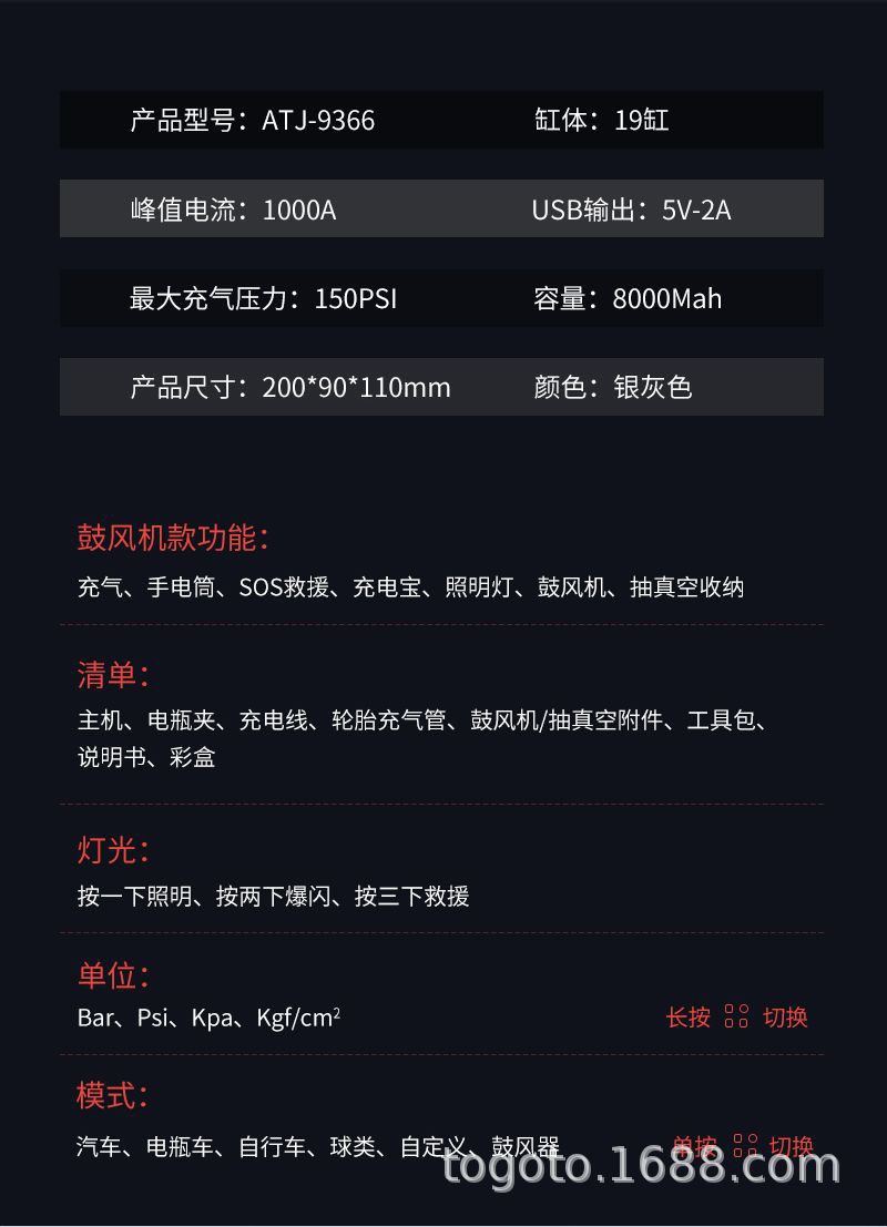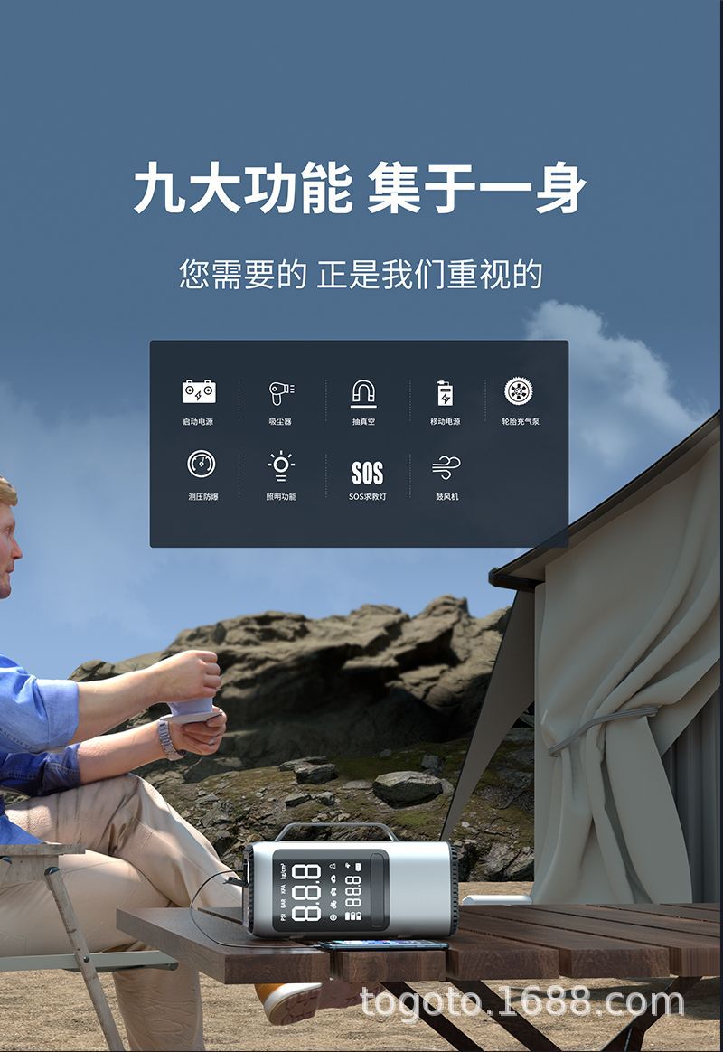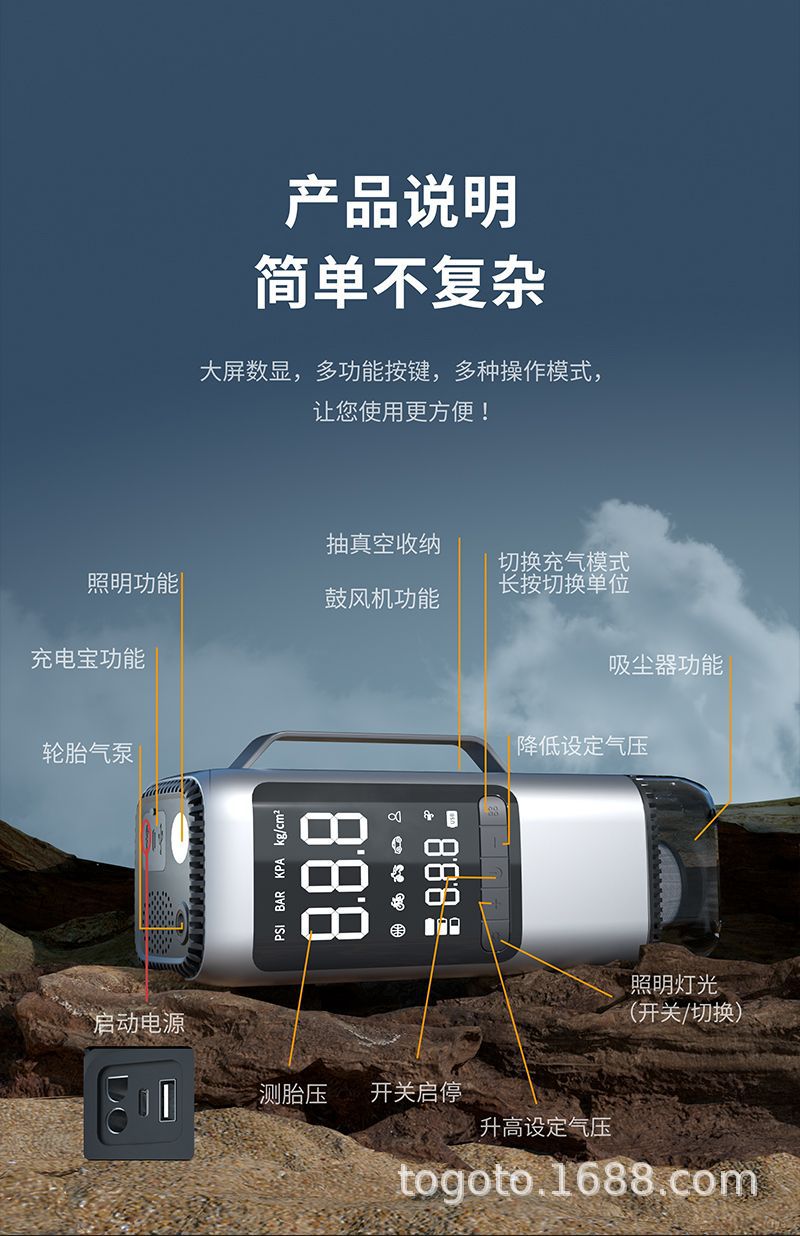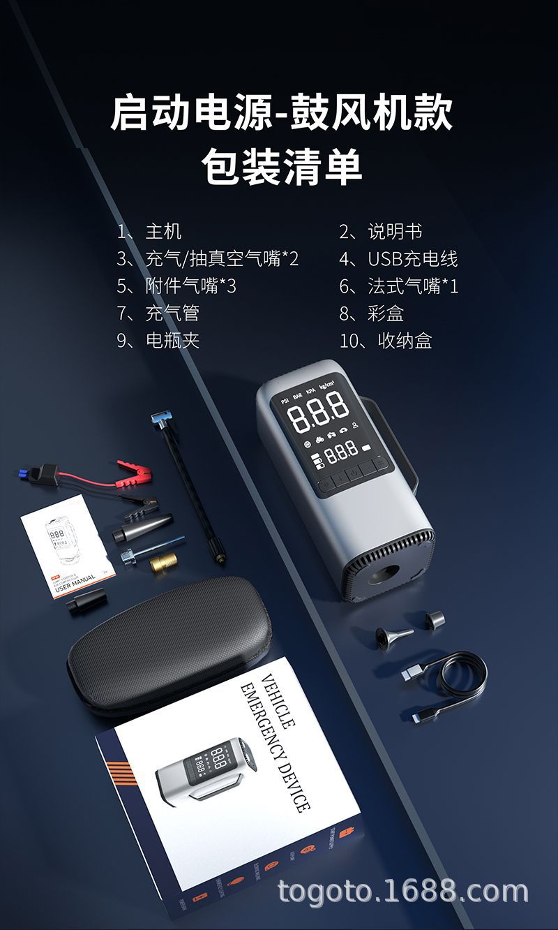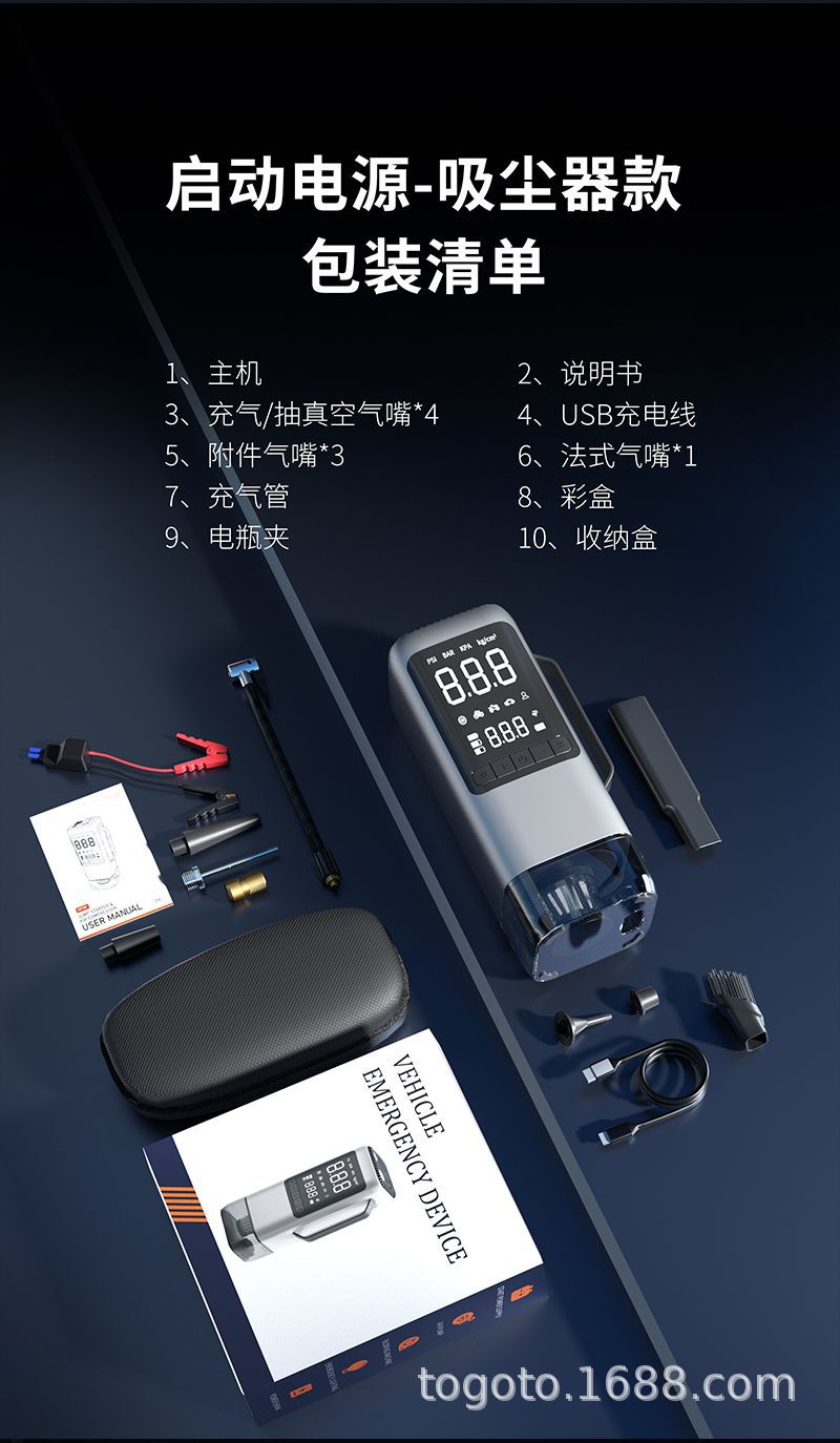 -Function(功能):1.启动电源2.轮胎充气泵3.测试轮胎气压4.鼓风机5.抽真空6.充电宝7.照明灯8.SOS求救灯9.吸尘器