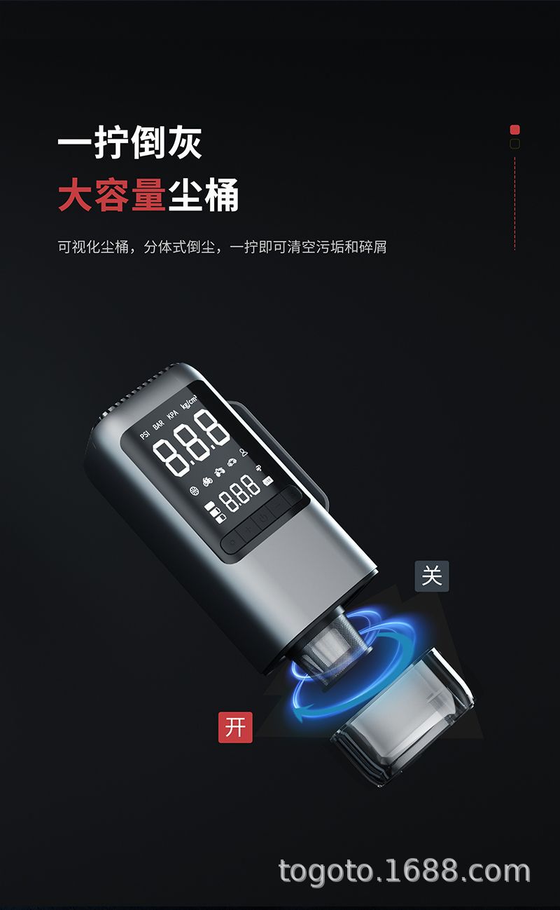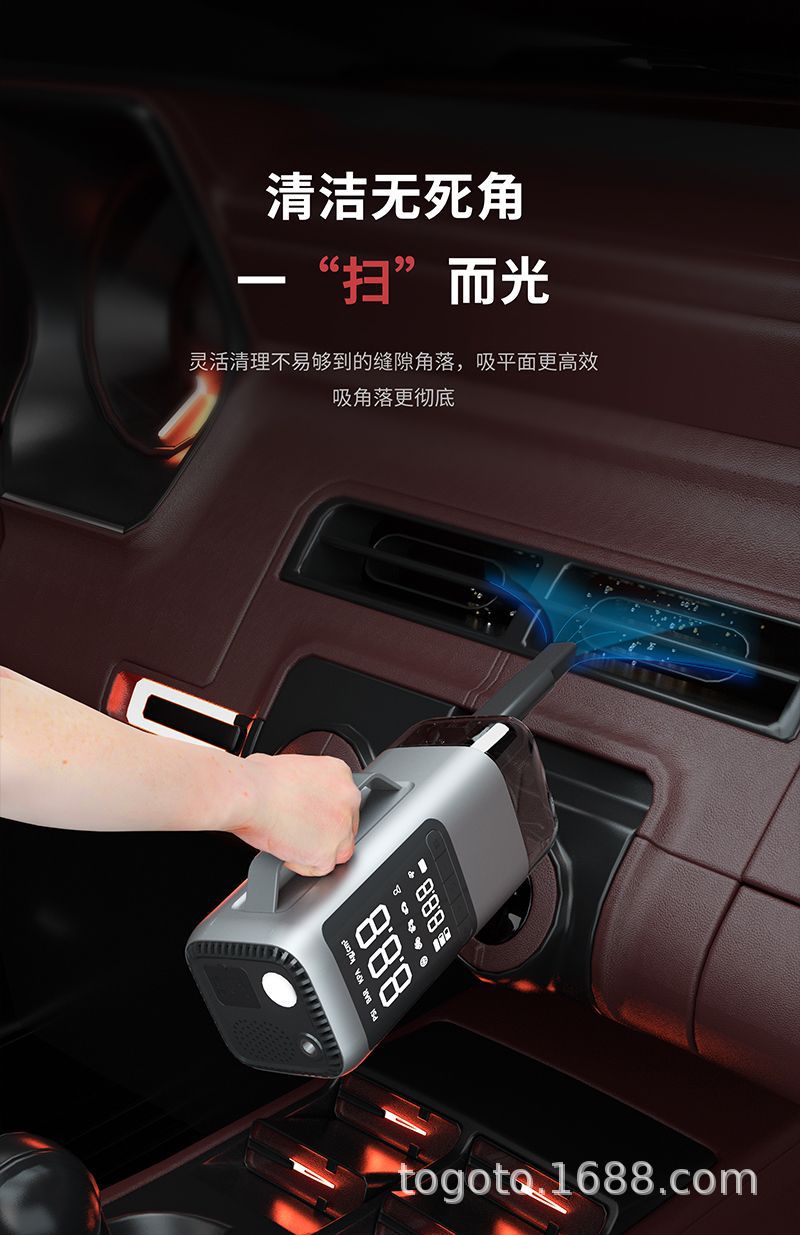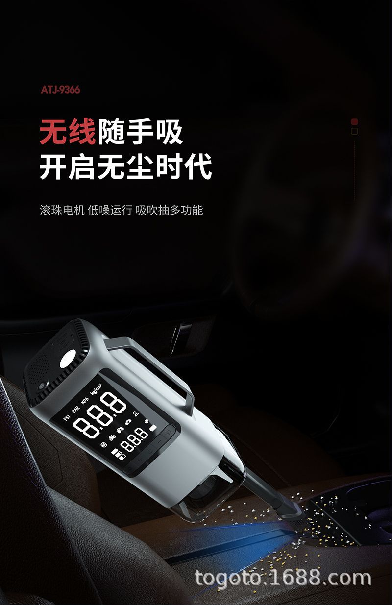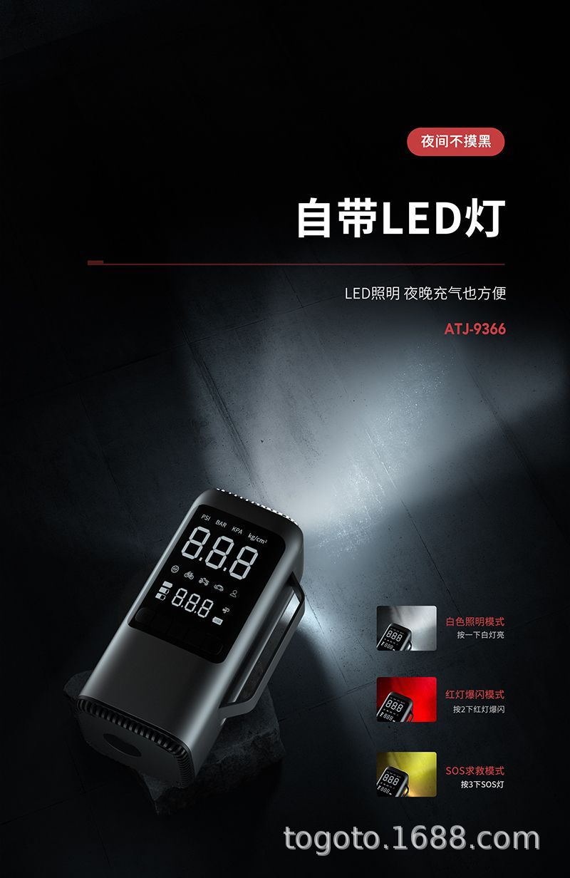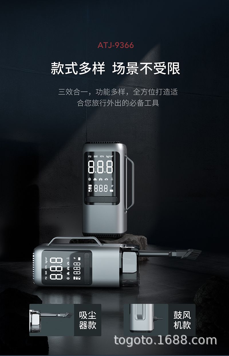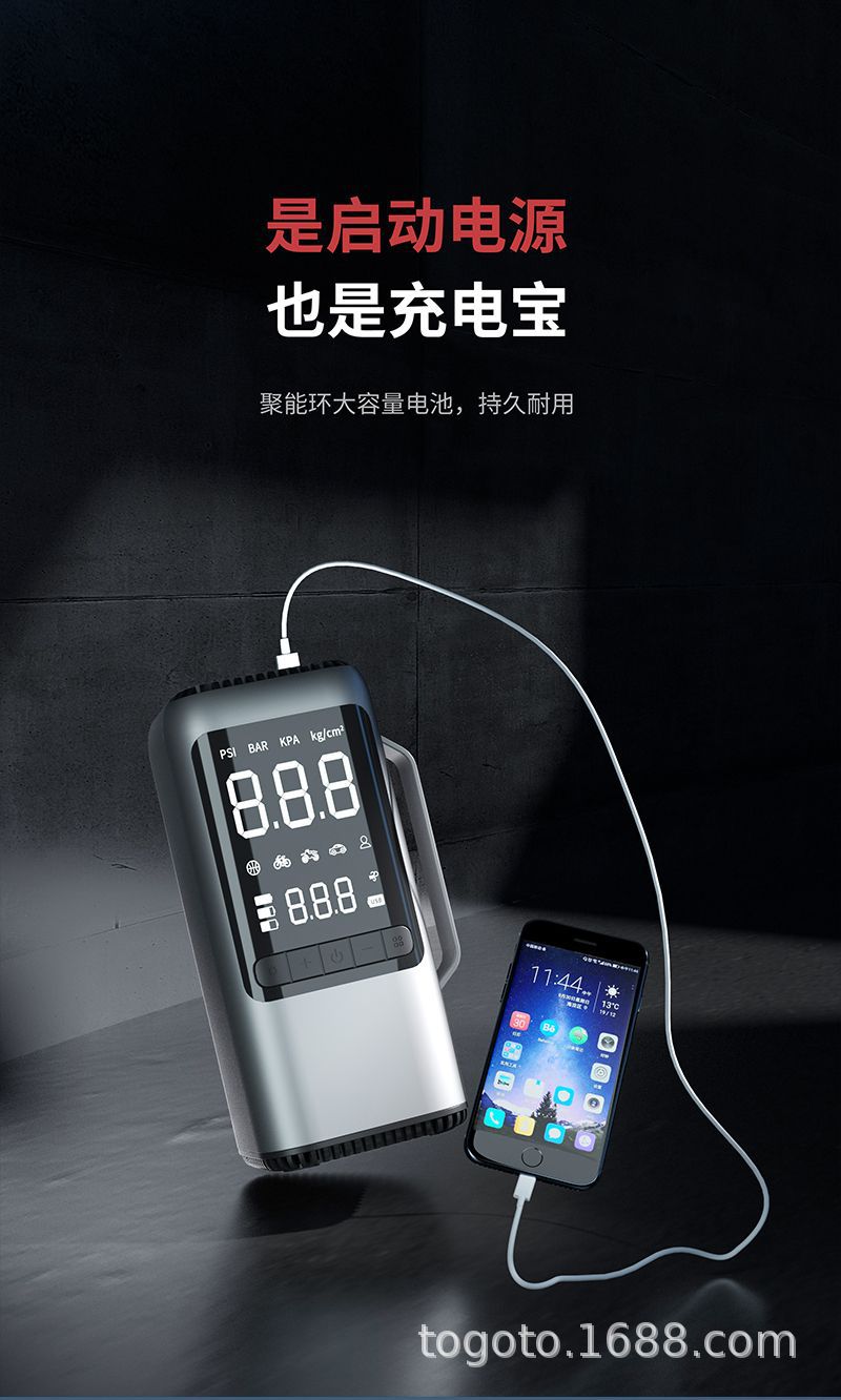 -Function(功能):1.启动电源2.轮胎充气泵3.测试轮胎气压4.鼓风机5.抽真空6.充电宝7.照明灯8.SOS求救灯9.吸尘器