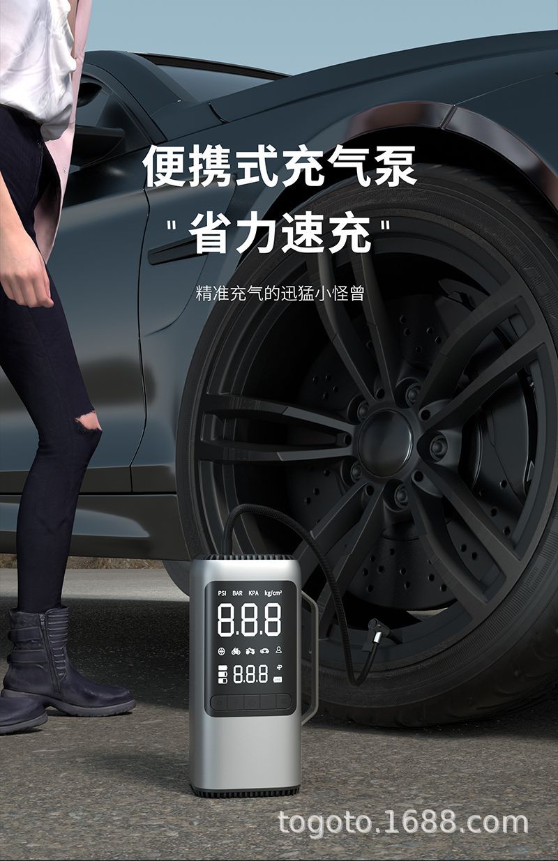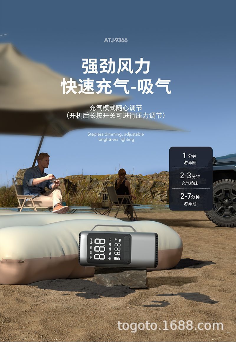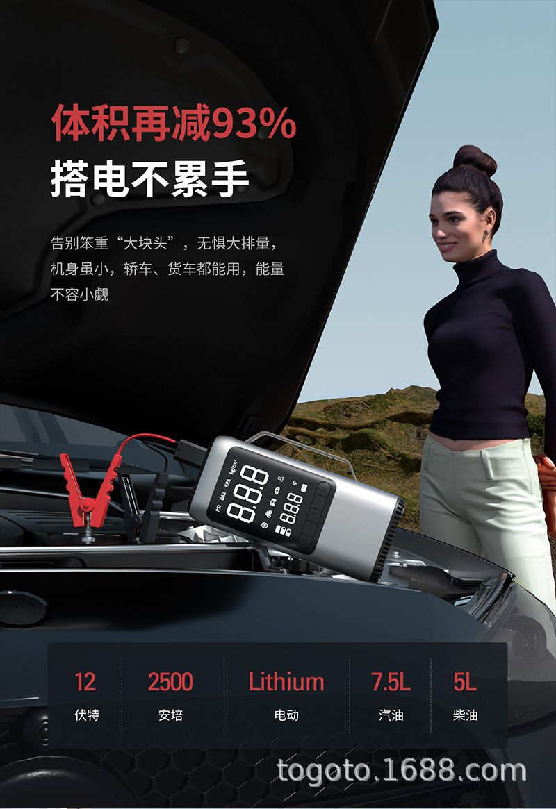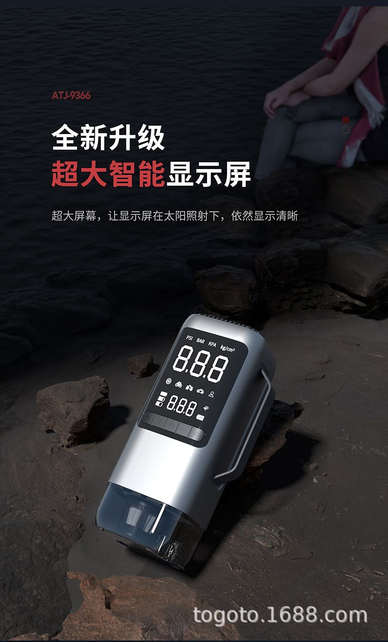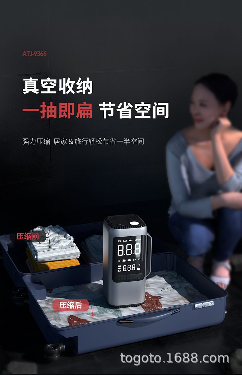 -Function(功能):1.启动电源2.轮胎充气泵3.测试轮胎气压4.鼓风机5.抽真空6.充电宝7.照明灯8.SOS求救灯9.吸尘器