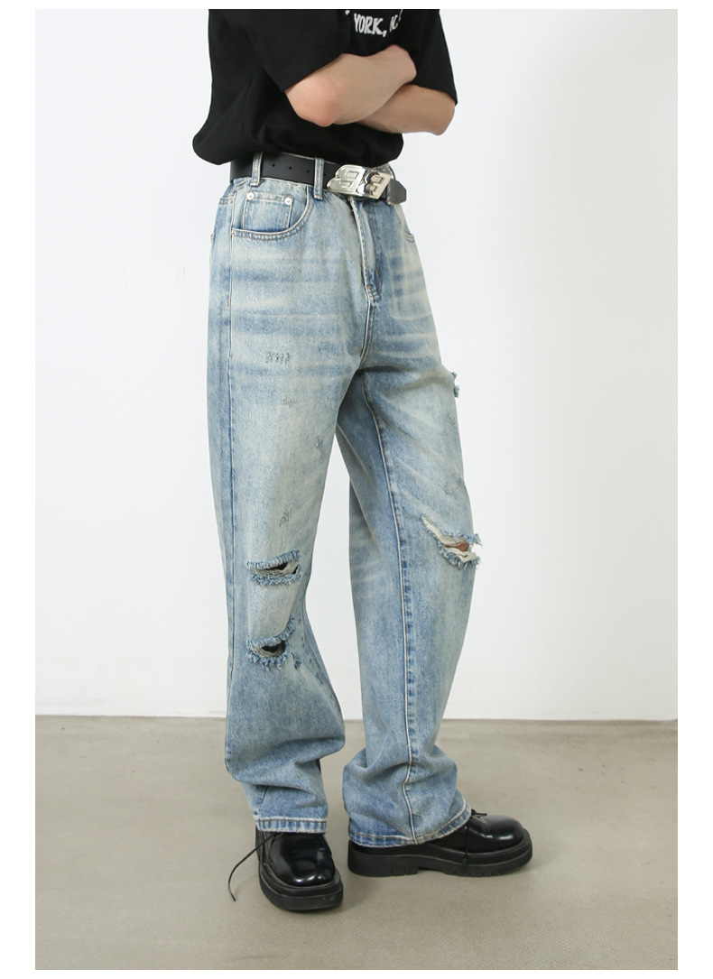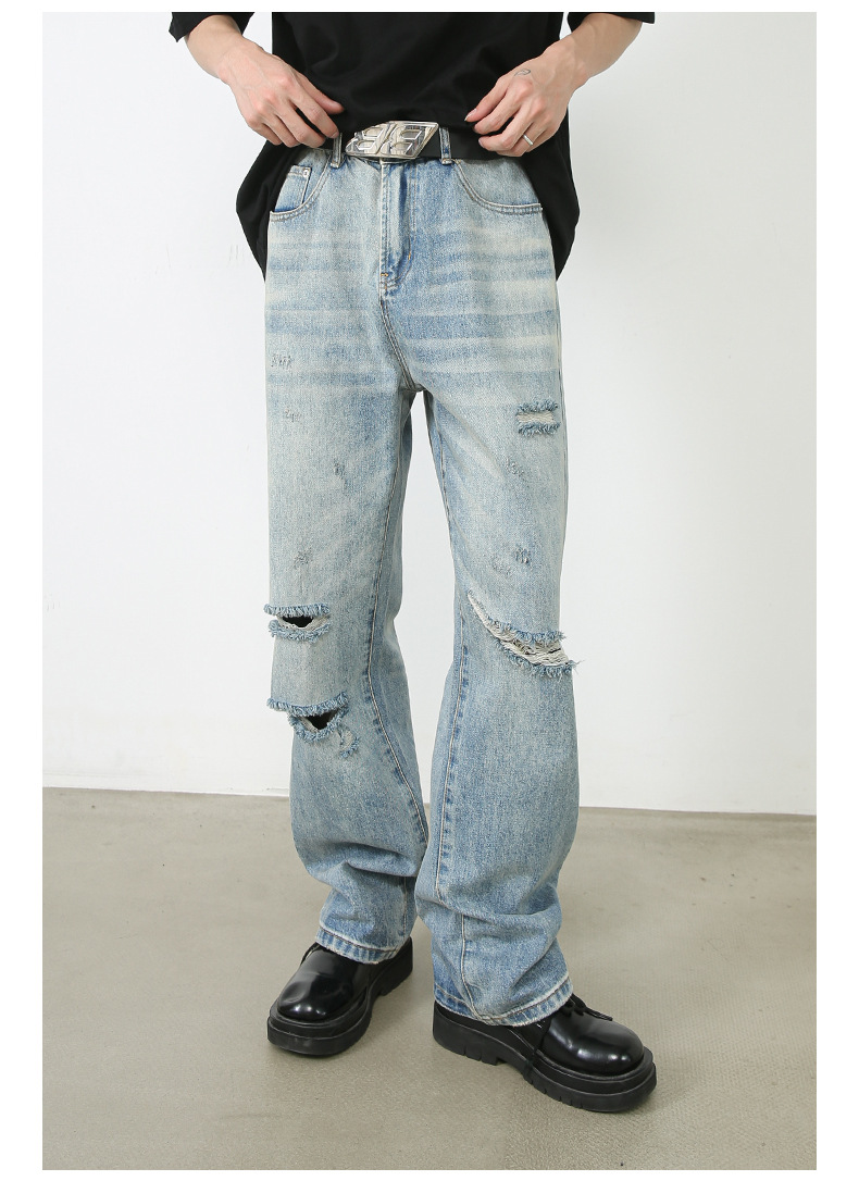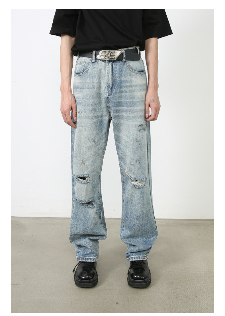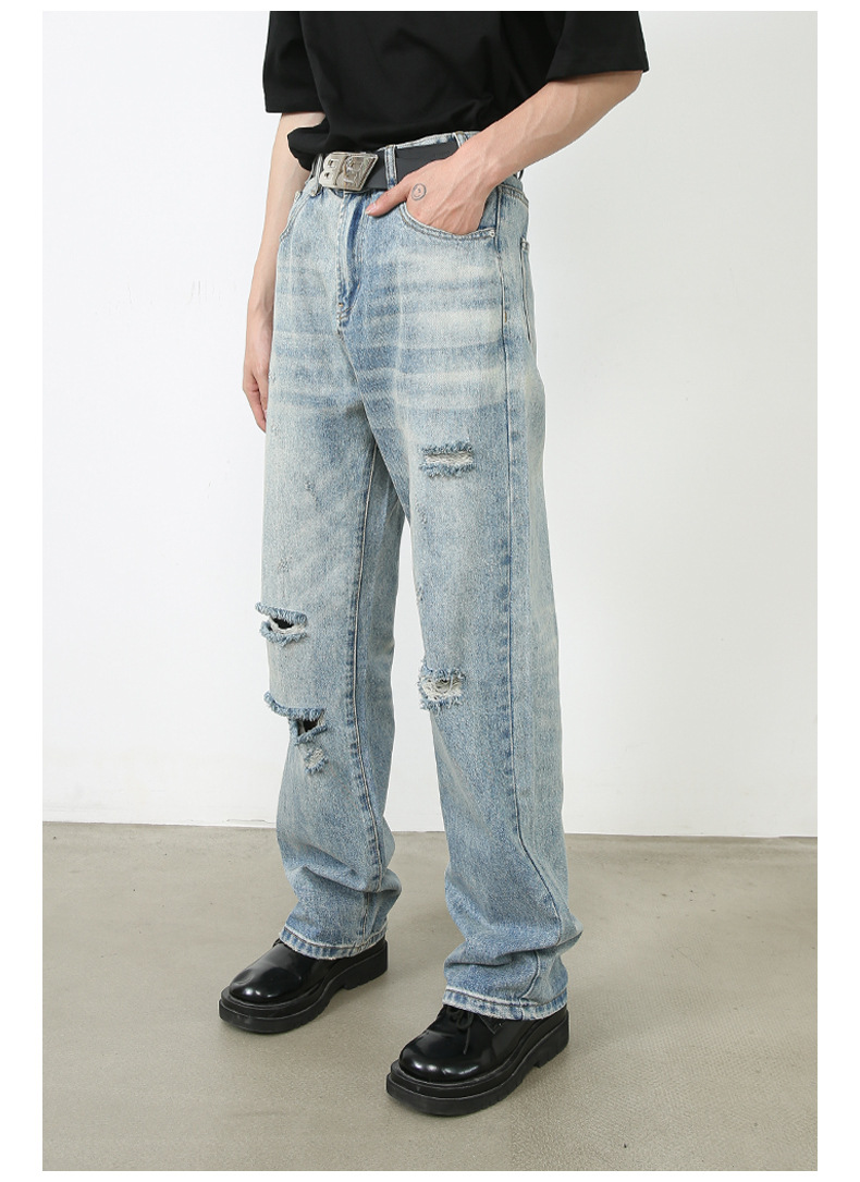 Nirbenデニム | ジーンズ穴を割った男性アメリカのゆるいレトロな水洗いストリートファッションのストレートパンツ
