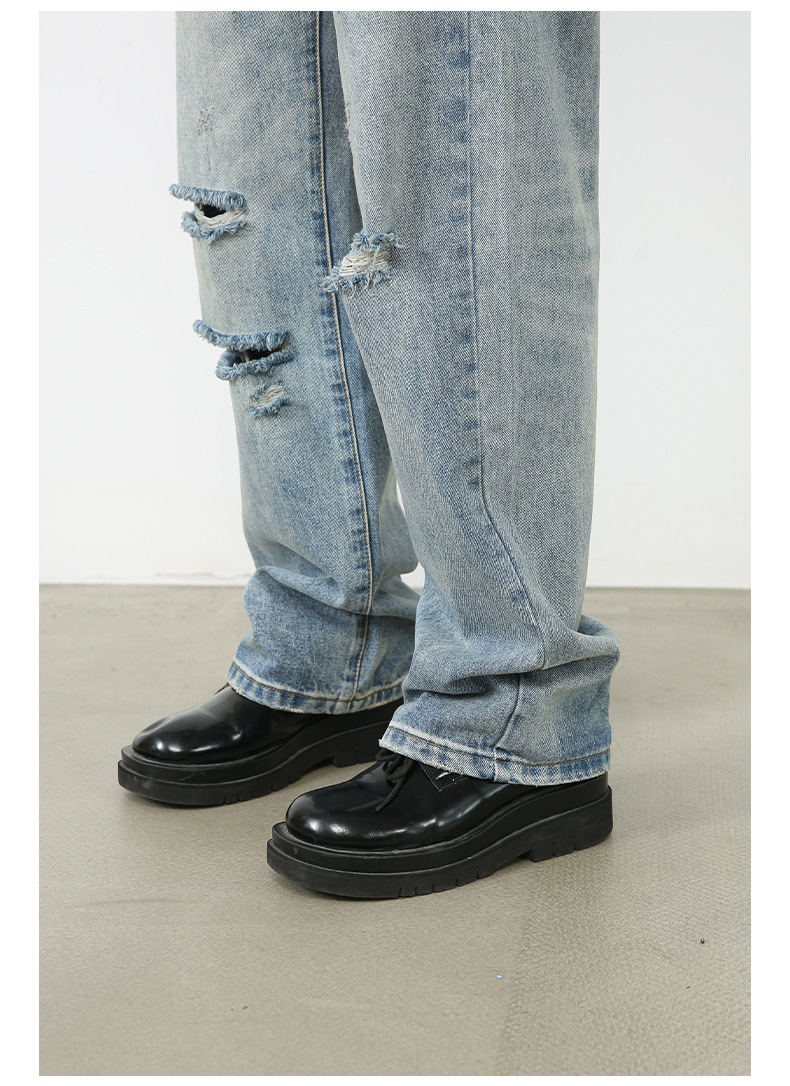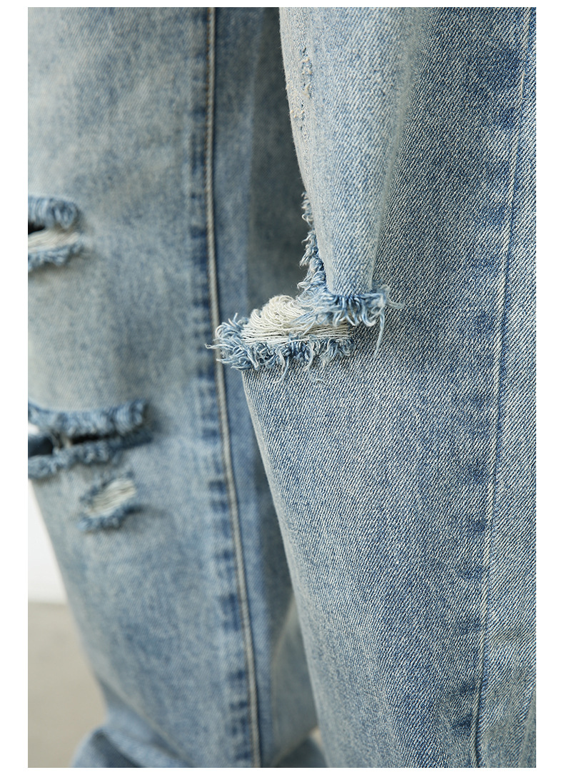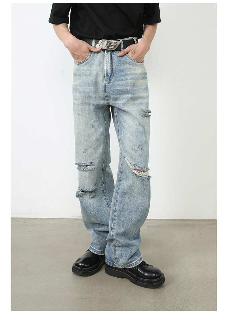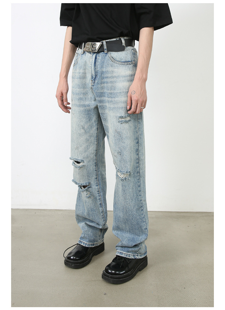 Nirbenデニム | ジーンズ穴を割った男性アメリカのゆるいレトロな水洗いストリートファッションのストレートパンツ