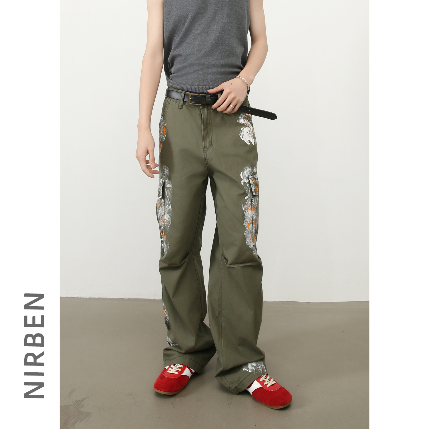 Nirbenカウボーイ | アメリカのレトロ古い手作り落書き多ポケット工装ズボン男性ゆるいカジュアルストレートパンツ