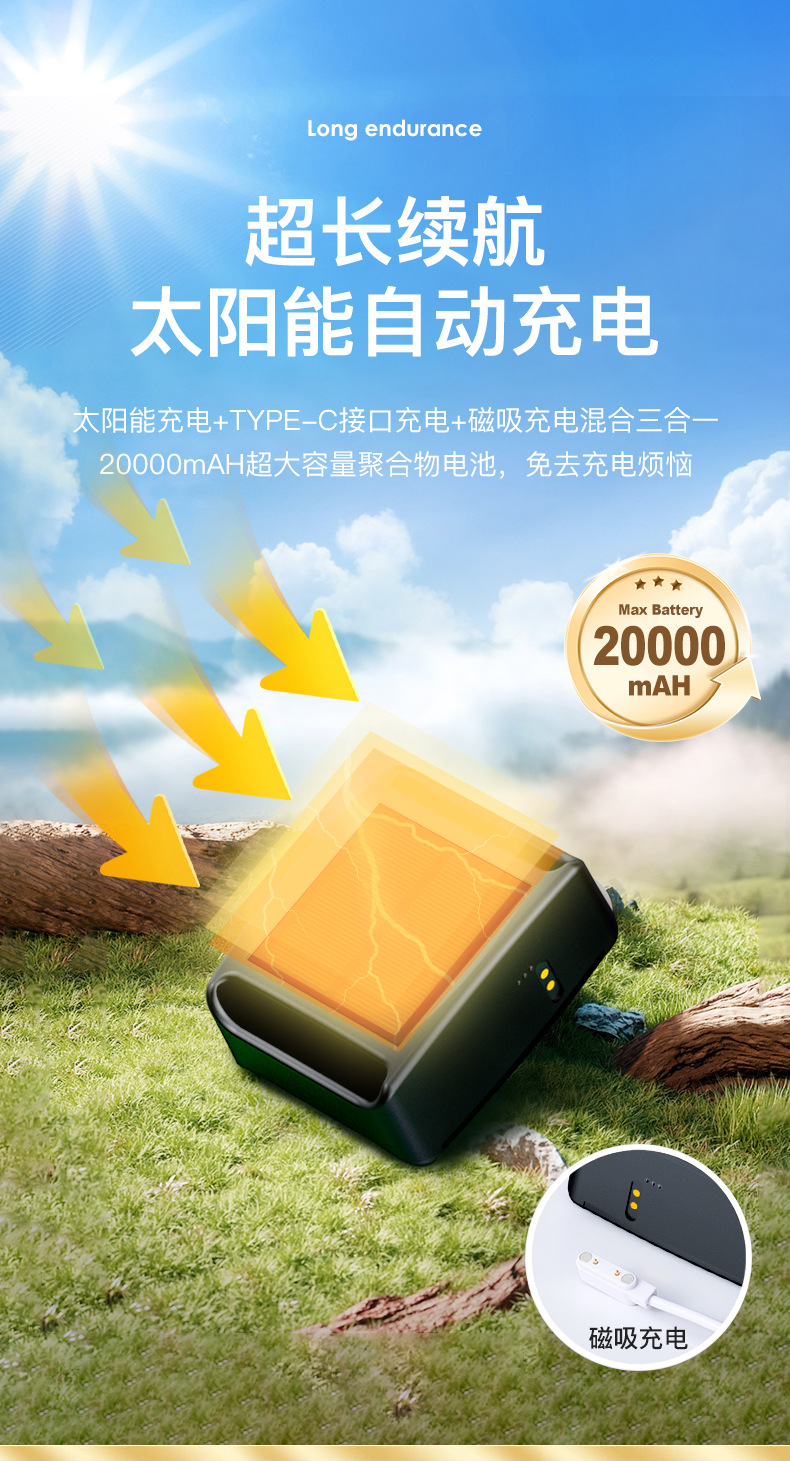 充電方式 ソーラー充電 + TYPE-Cインターフェイス充電 + マグネット式充電ハイブリッド