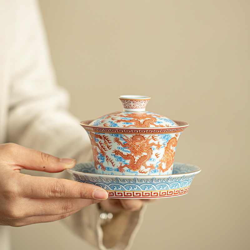 景徳鎮の手作りの馬蹄の蓋の碗の単一の家庭用のの赤い九竜の陶磁器の茶器の家庭用の工夫の蓋の碗