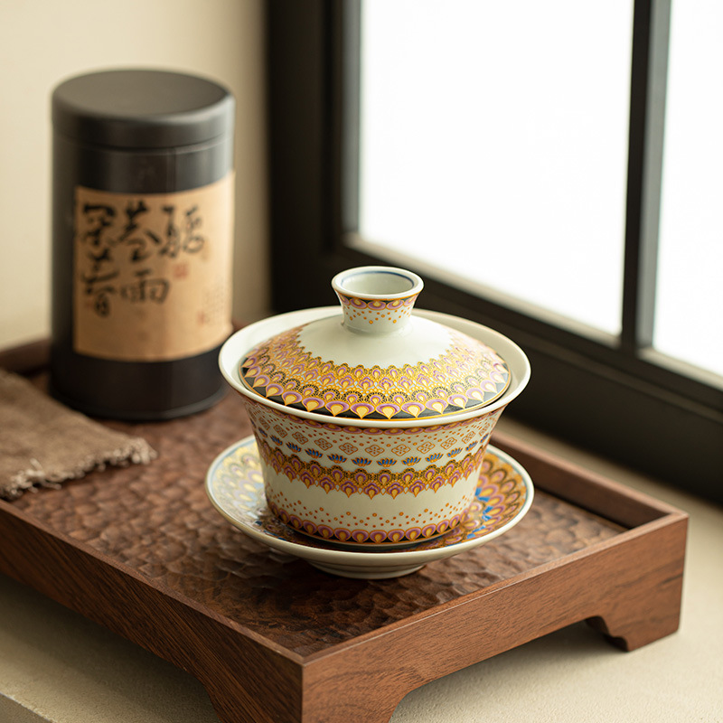 景德镇仿宋汝窑珐琅彩盖碗三才盖碗金玉满堂盖碗陶瓷茶具功夫茶碗