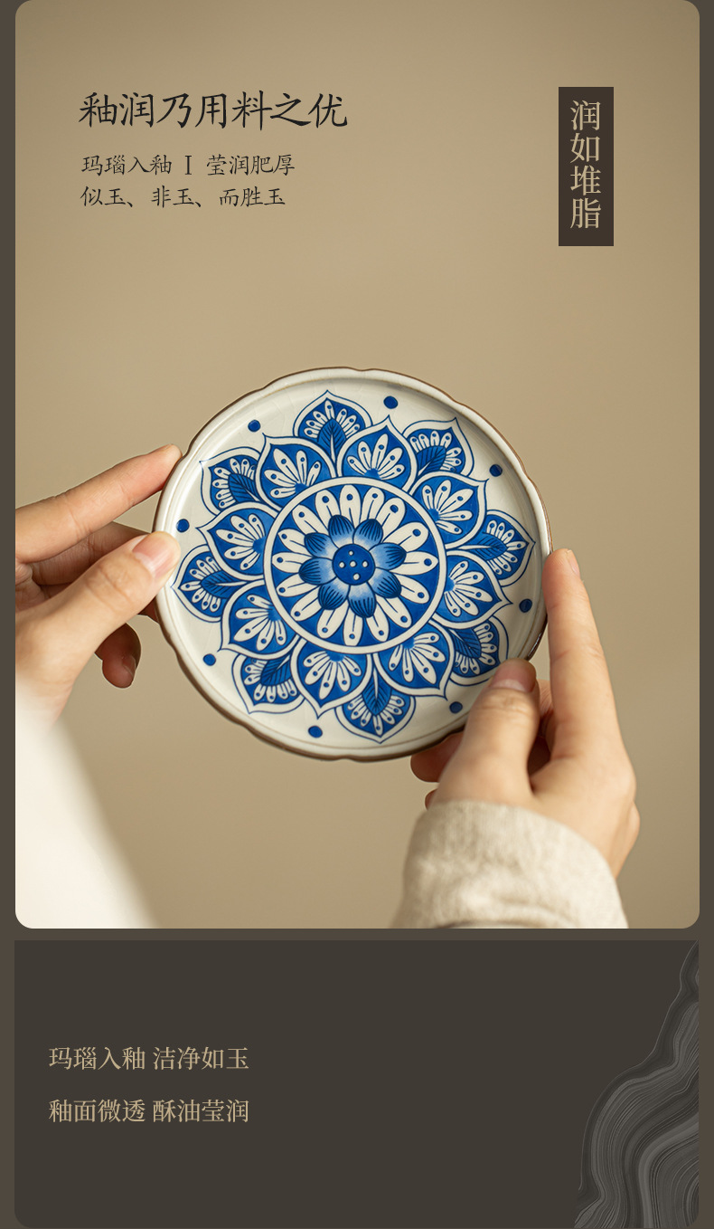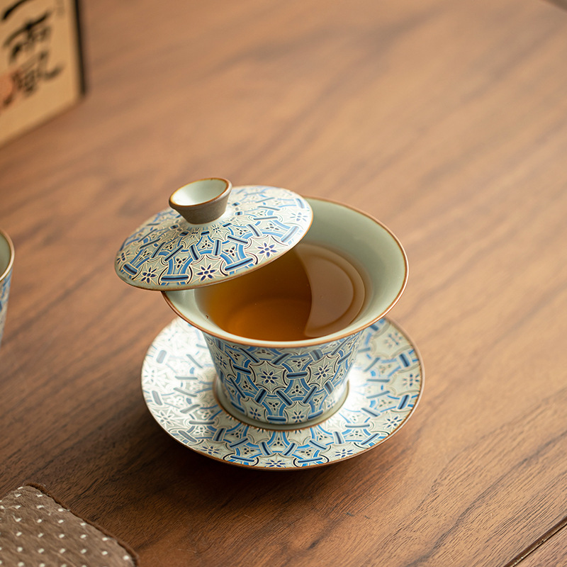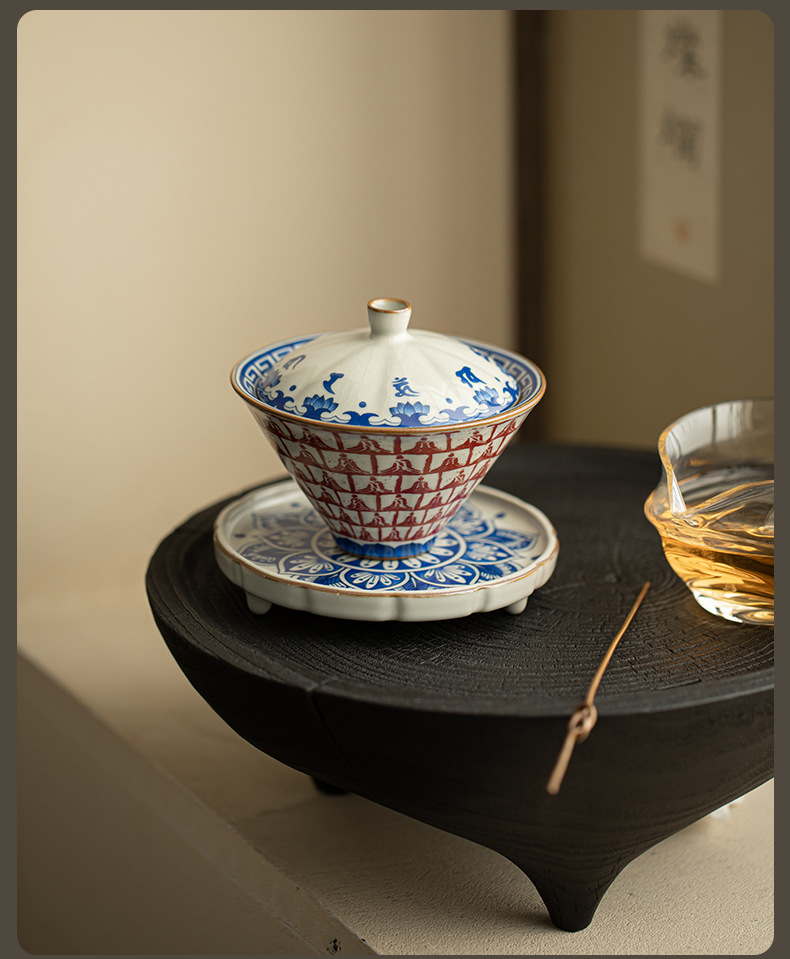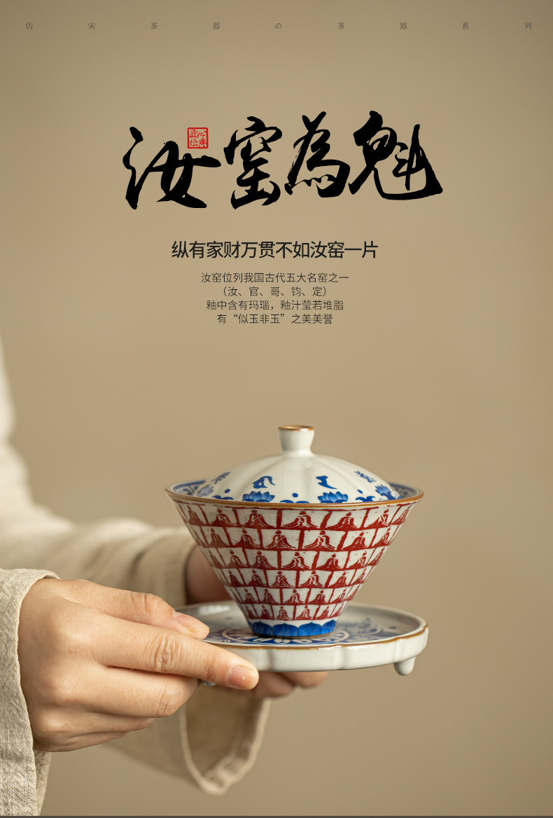 景徳鎮汝窯元青花三才蓋碗陶磁器茶道具元宝蓋碗茶碗蒸し茶碗開片可養