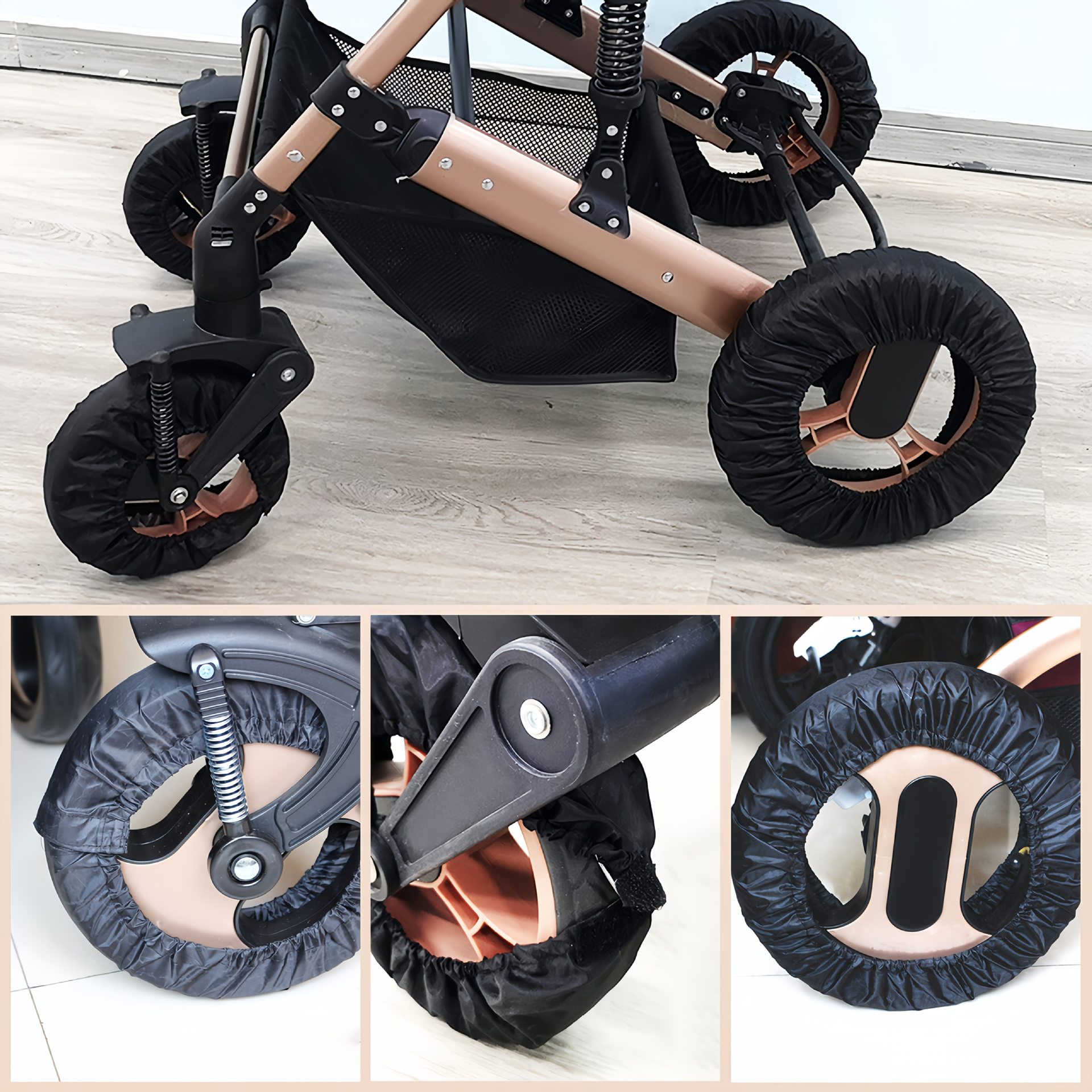 ベビーカー用ホイール防汚ダストカバー4個、防水ベビーカーホイールカバー、カバーを巻いても回転可能
