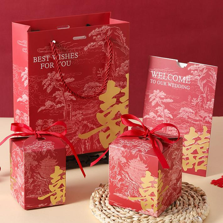 結婚喜糖箱招待状礼箱袋三点セット中国式箔押し結婚式婚約空箱糖箱セット
