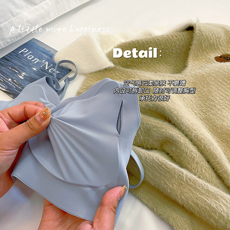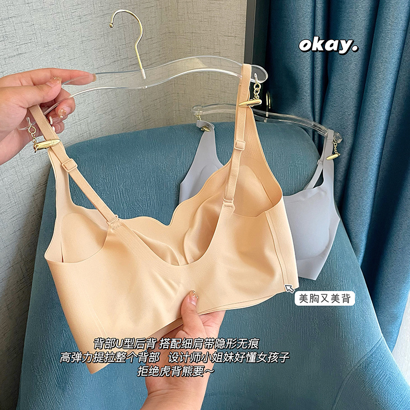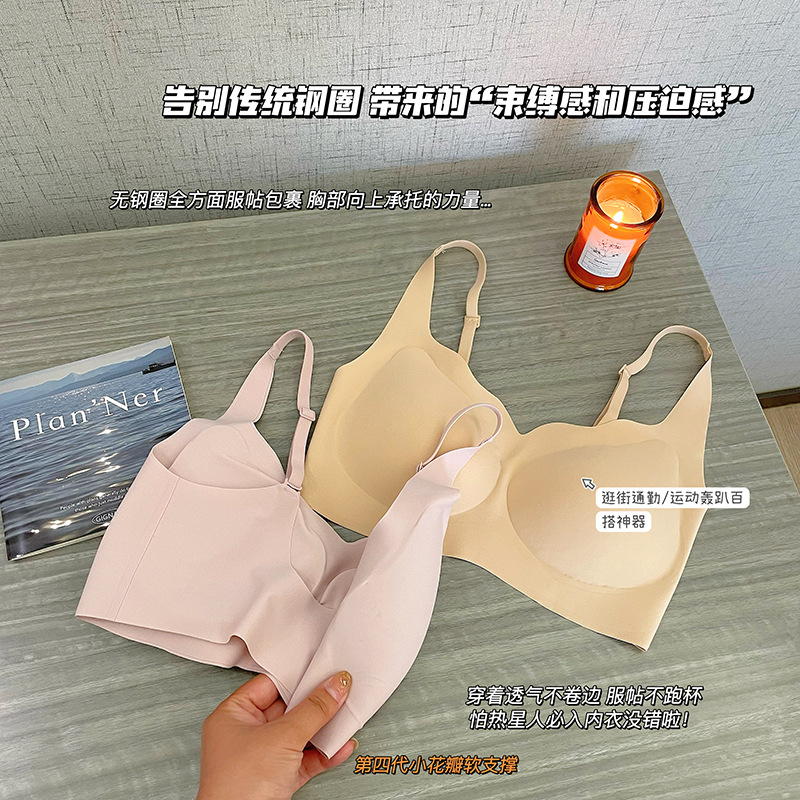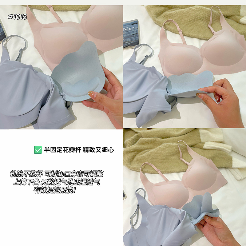 女性用シームレス下着、ワンピース小胸プッシュアップU字ブラ、ベスト風固定カップ、細いショルダーストラップ、小花びらブラ