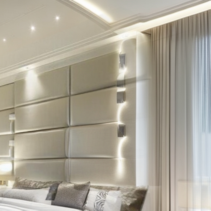 家庭の客間の寝室の書斎は防音してホテルのベッドの頭の壁面の柔らかい包みの背景の壁にぶつかって来ます。