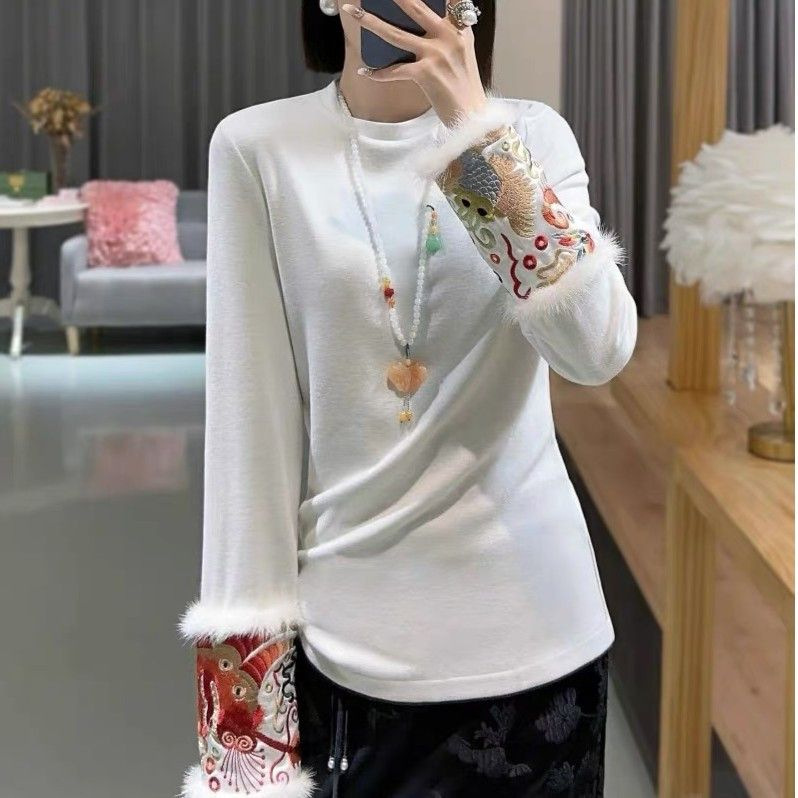 新中国式の国風刺繍シャツの女性は2024年秋冬立襟とベルベットが長袖の保温国潮上着を厚くした