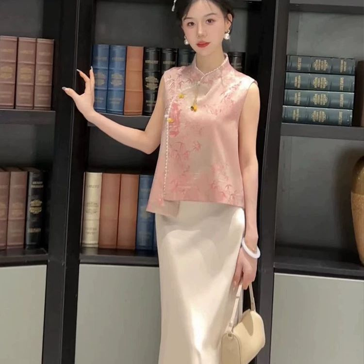 2025 新中国風のノースリーブベスト夏薄いサテンジャカードヘビービーズファッション多用途ベスト