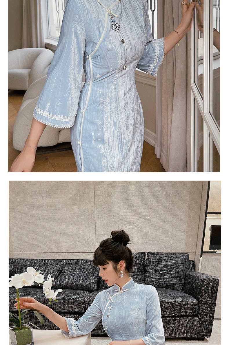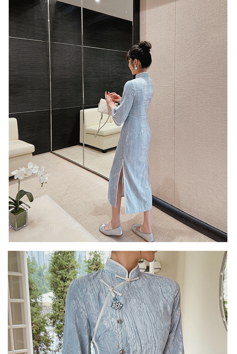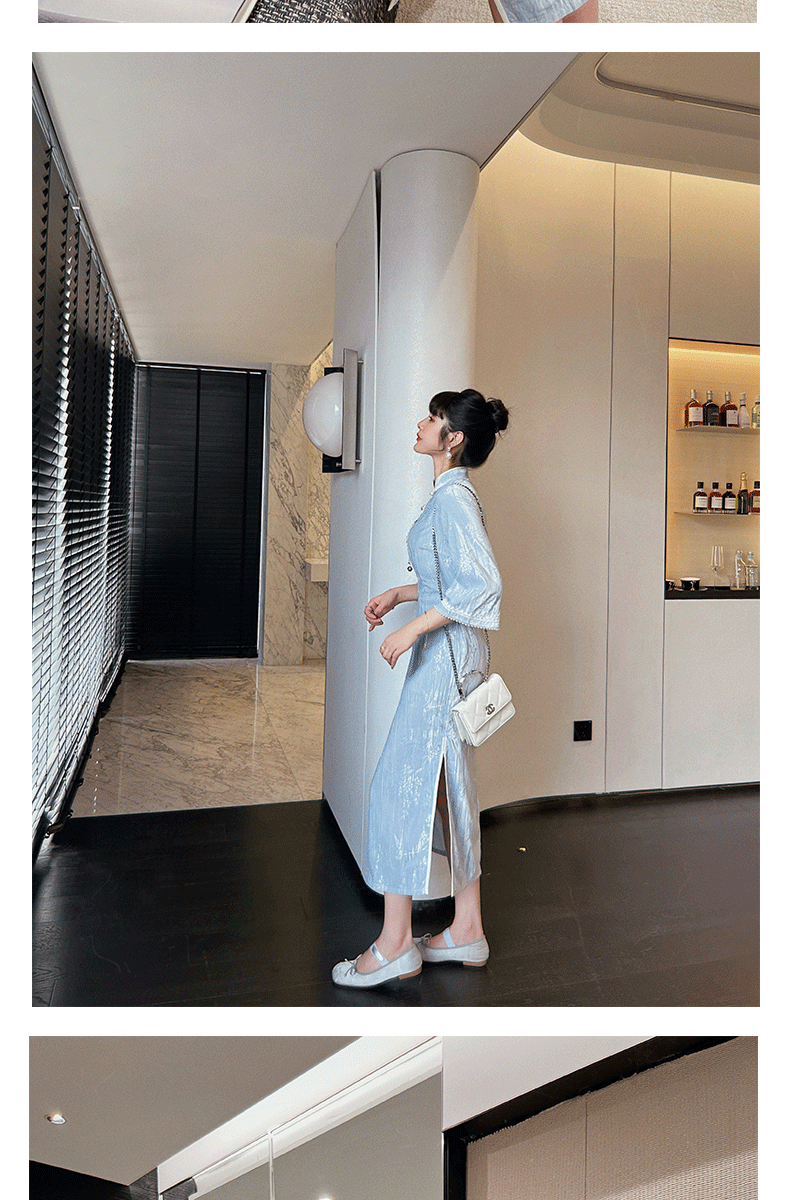若いタイプの清新な風の少女のチャイナドレスのスカートの2024年春秋の新型はやせている日常の高級感の青いワンピースを現します。