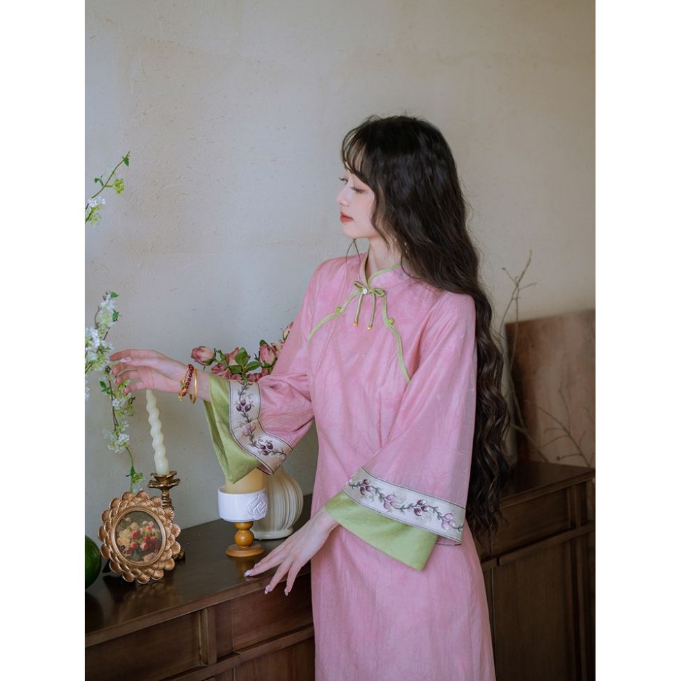 [Chunniao] 新しい中国風のピンクの女の子のチャイナドレスデイリー刺繍ダブルブレストスリムフィット改良ドレス女性用