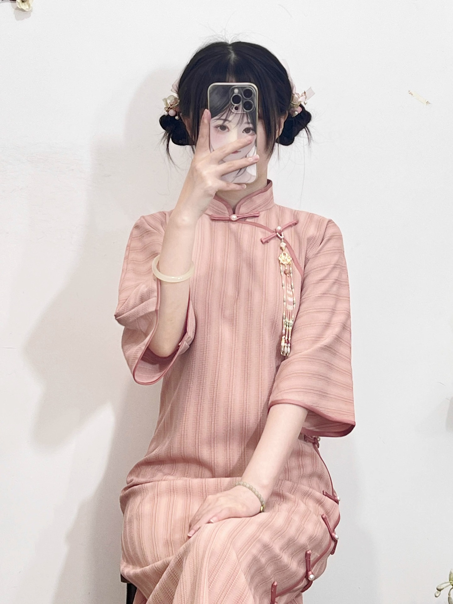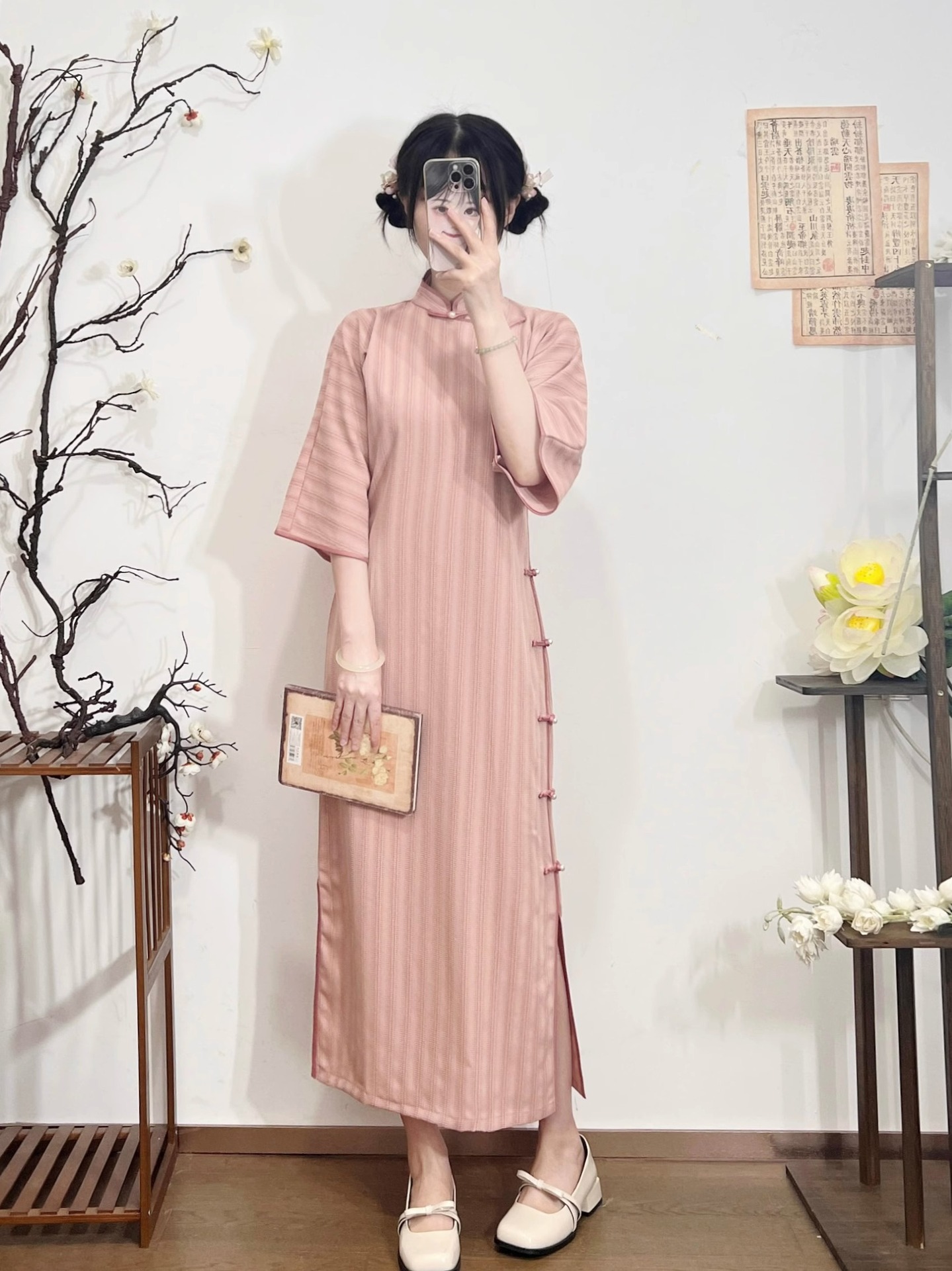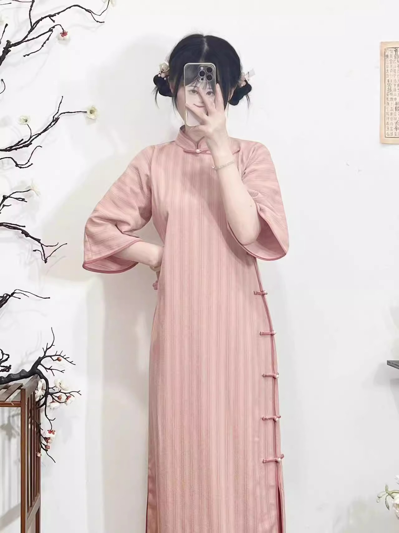 ピンクの新しい中国風チャイナドレス、ハイエンドで雰囲気のある2025新しい夏の古代スタイルのダブルブレストの美しい婚約ドレスロングスタイル