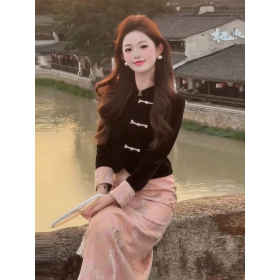 新中国式の国風のスーツの気質の復古の盤は黒色のコートの半身のスカートの高級な小さい洋装の2セットの春の春の春の春を掛けます。