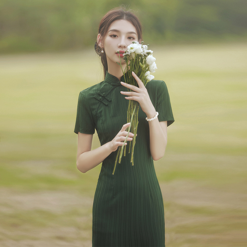 レトロなチャイナドレス、女性用、夏用改良版、2025年新作、グリーン、芸術的、中華民国スタイル、若い女の子向け、エレガントで高級感のある