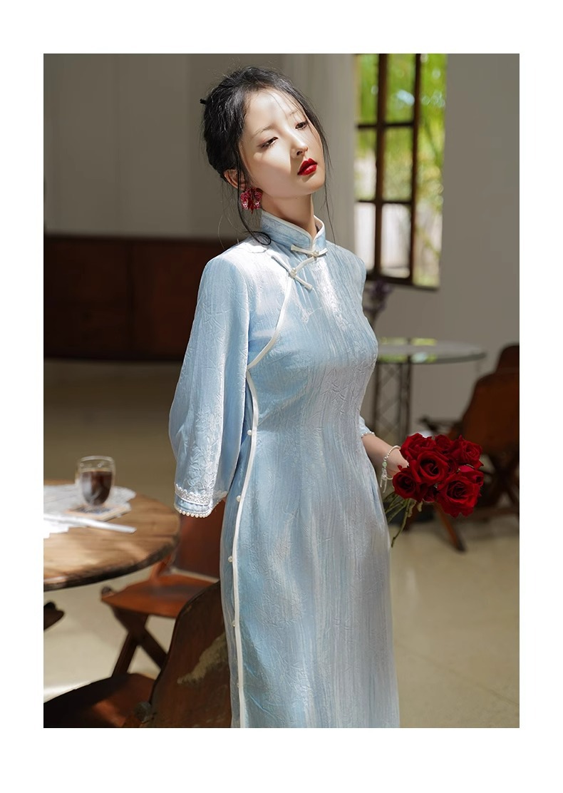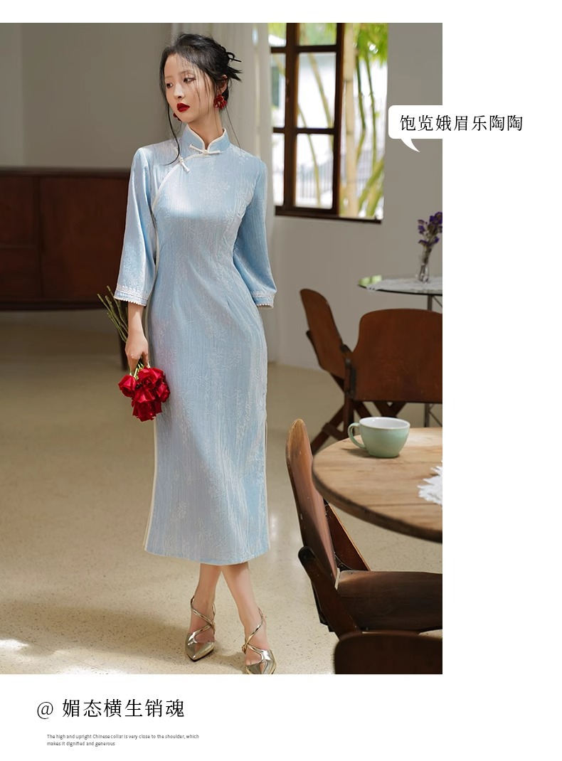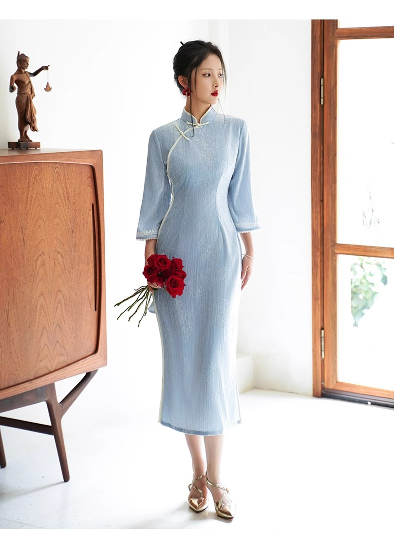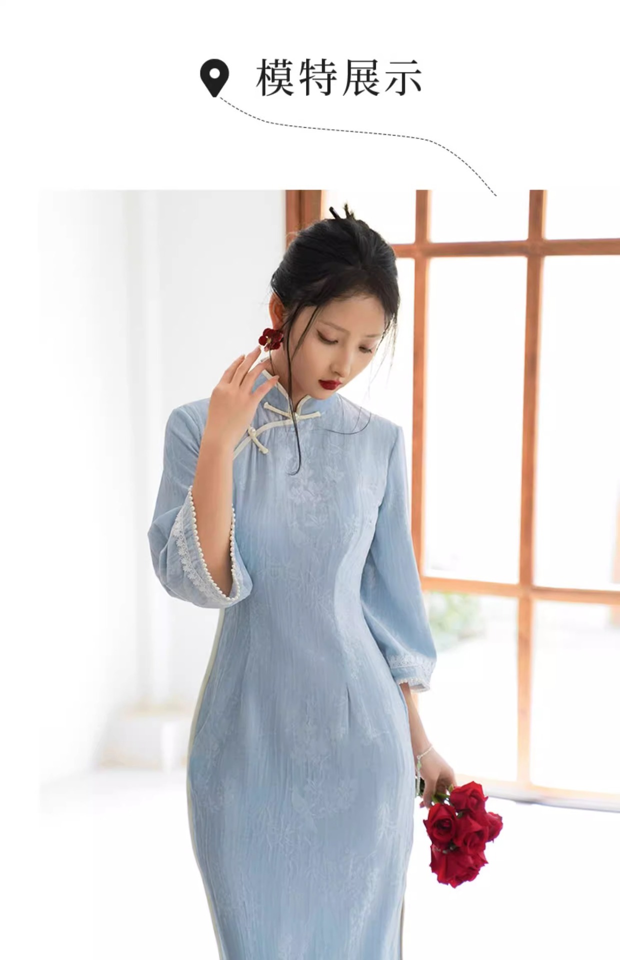 レトロ日常チャイナドレス2024新作小清新ブルー年会新中国式春夏新作シンプルワンピース