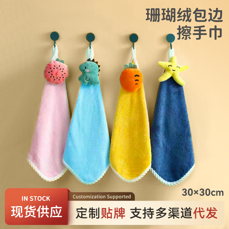 タオルを拭くのがかわいい吊り下げ式の吸水性が高いサンゴのベルベットのタオルを厚くして、子供の家庭用キッチンの速乾性の布を拭く