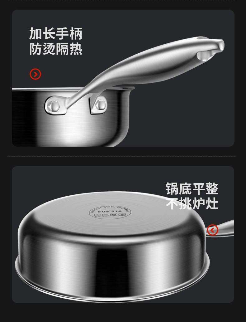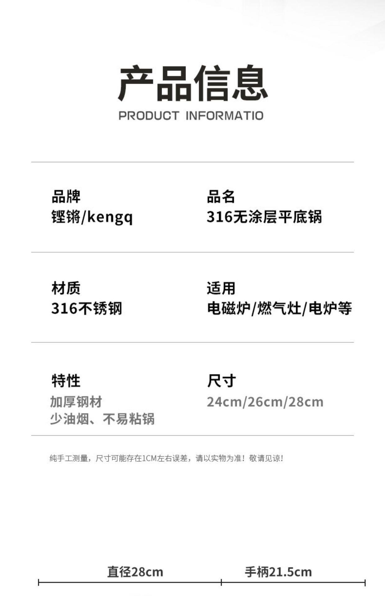 德国316不锈钢平底锅家用小号无涂层煎锅不粘锅电磁炉燃气灶通用