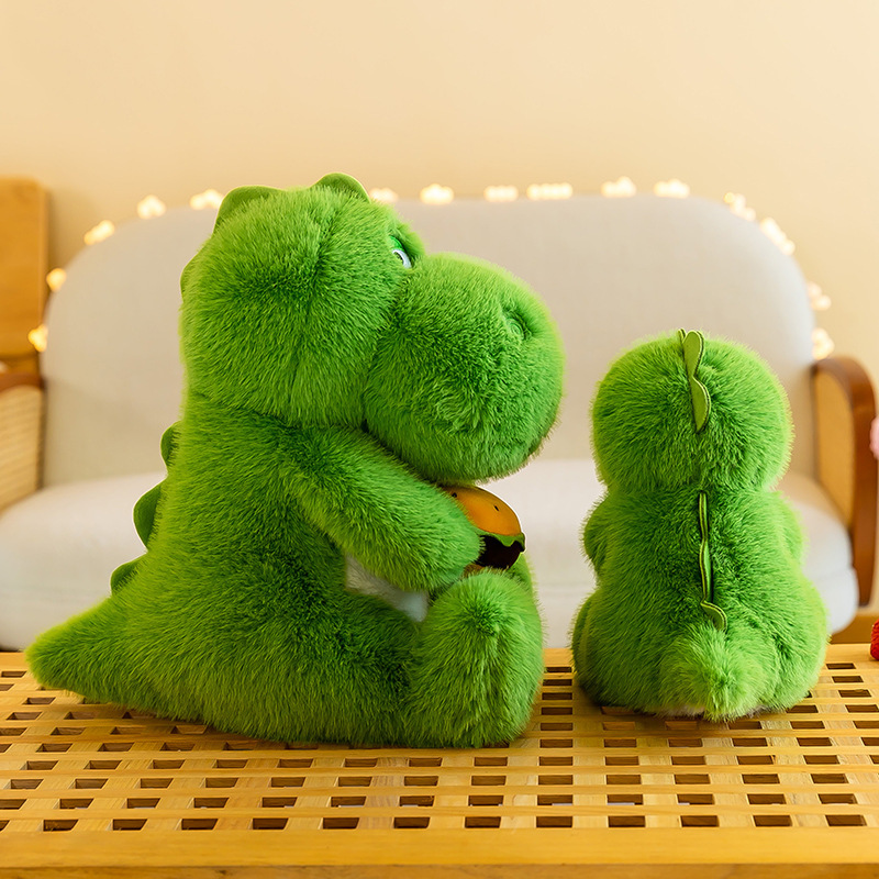 ぼんやりと萌えている恐竜の子供の男の子のぬいぐるみのベッドの上で枕を抱いて寝ている赤ちゃんのぬいぐるみの女性をなだめます。