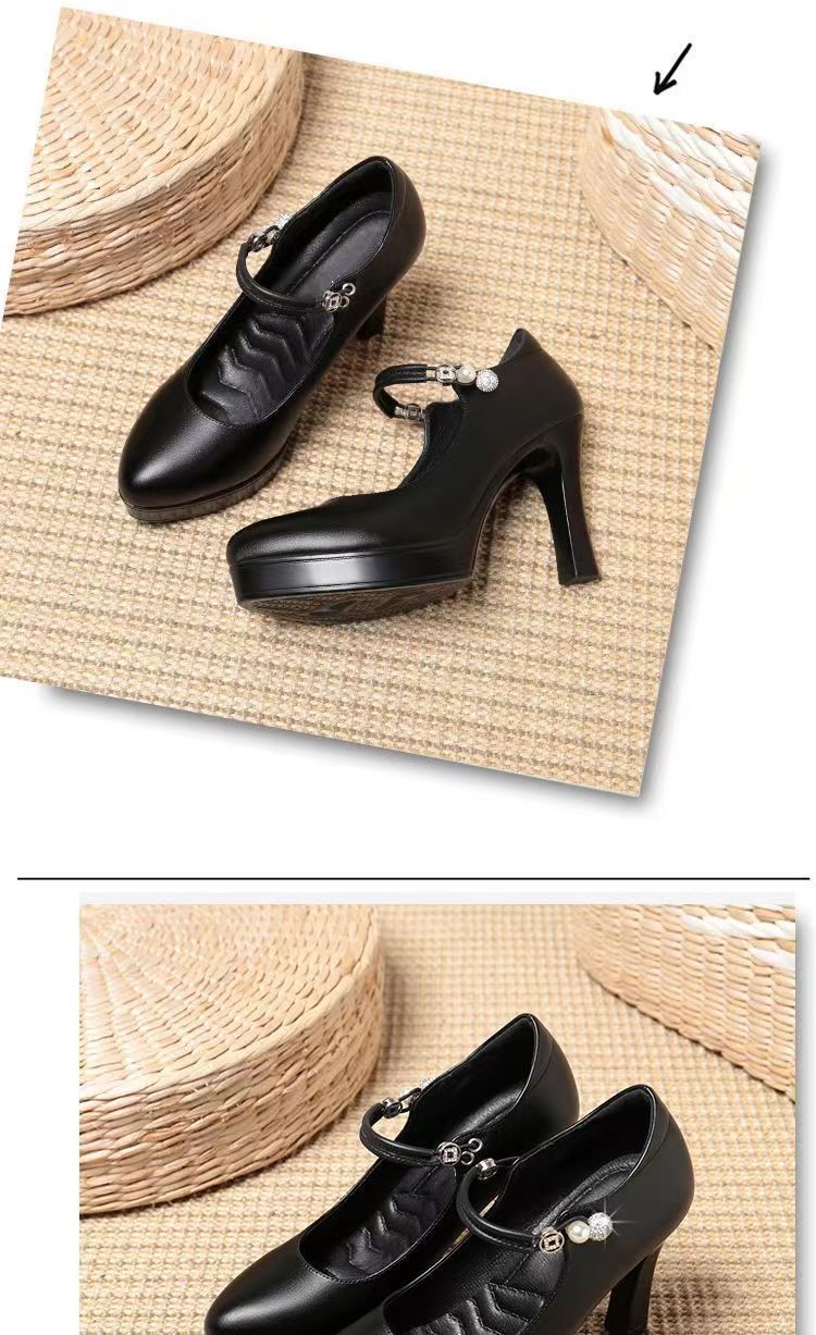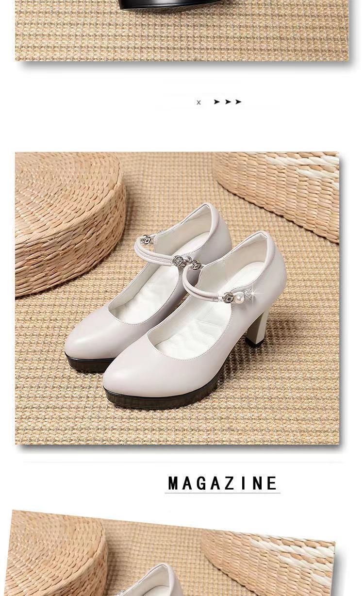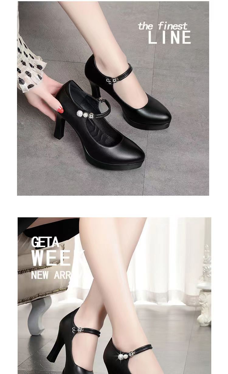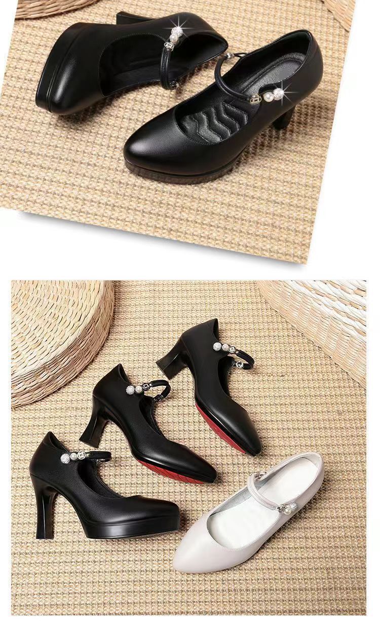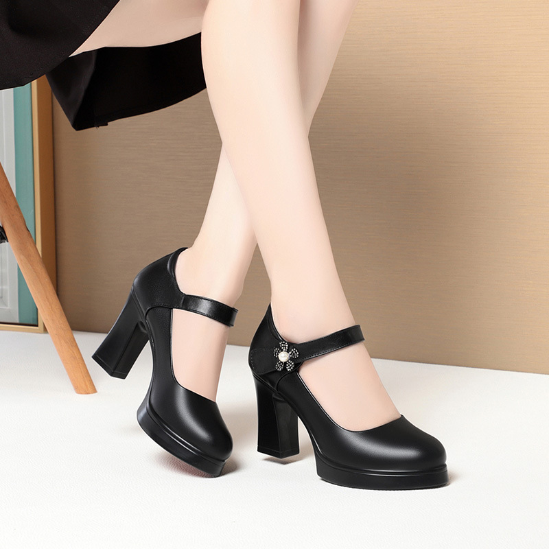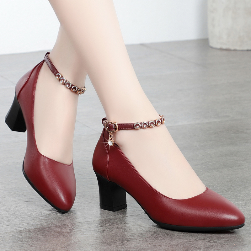 春と秋の新型の浅い口の先の本革の柔らかい底の百合の太いハイヒールの1字のバックルのお母さんの靴の作業靴の女性