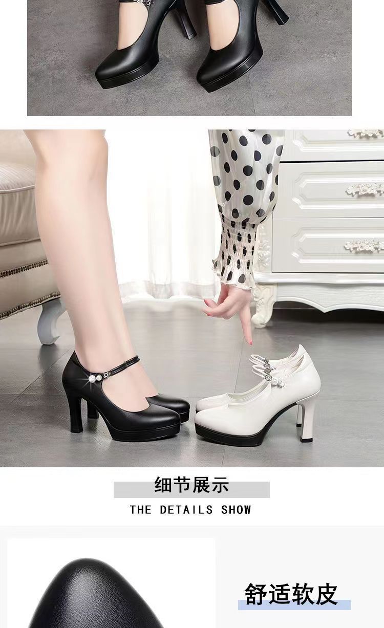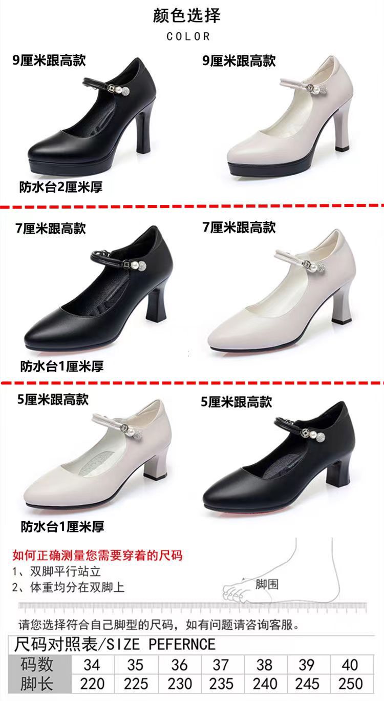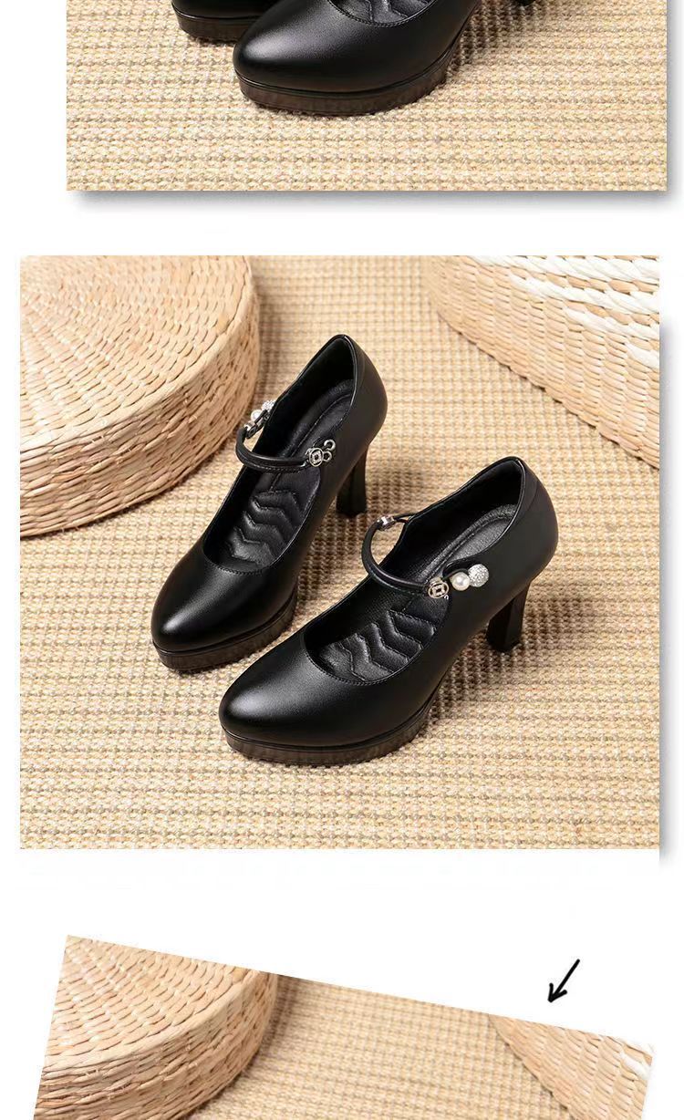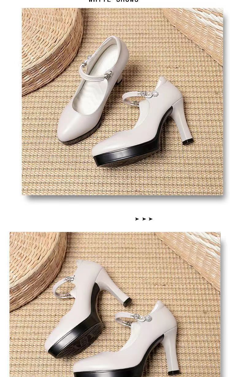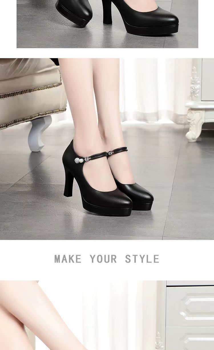 春と秋の新型の浅い口の先の本革の柔らかい底の百合の太いハイヒールの1字のバックルのお母さんの靴の作業靴の女性