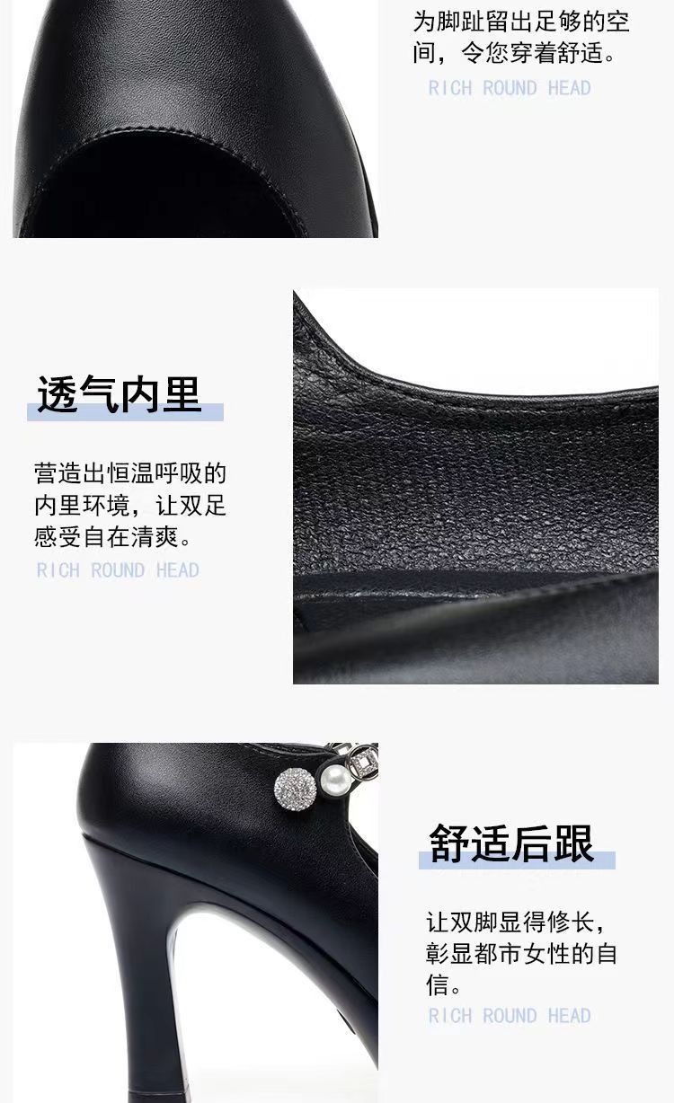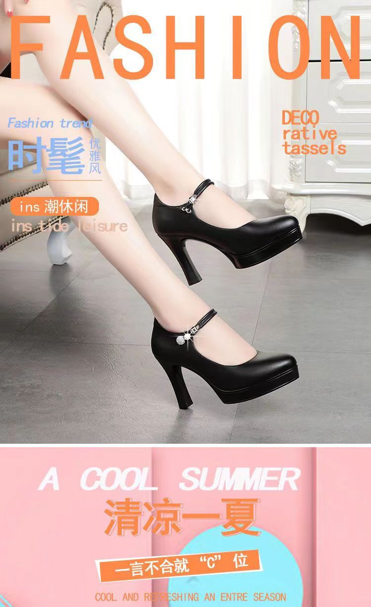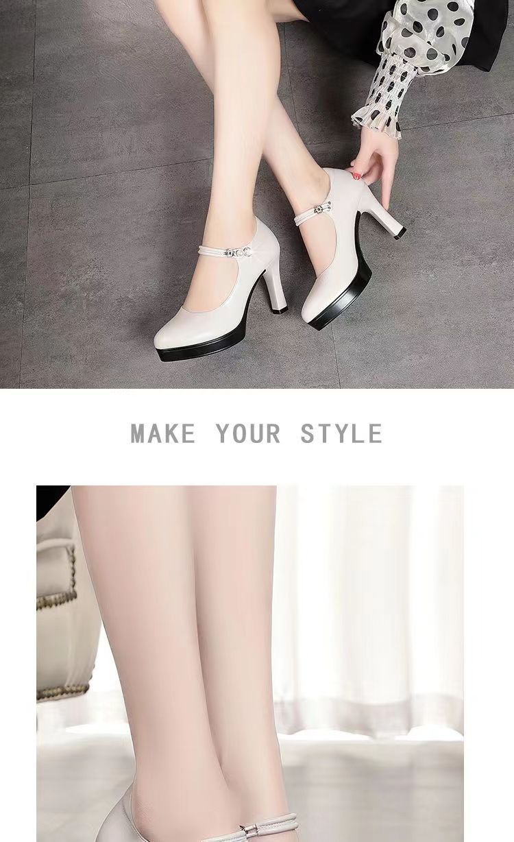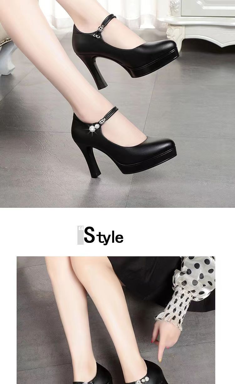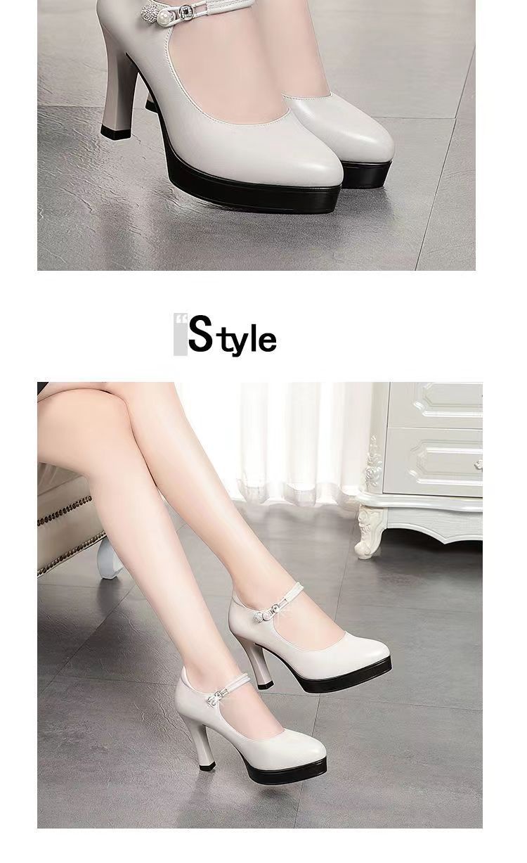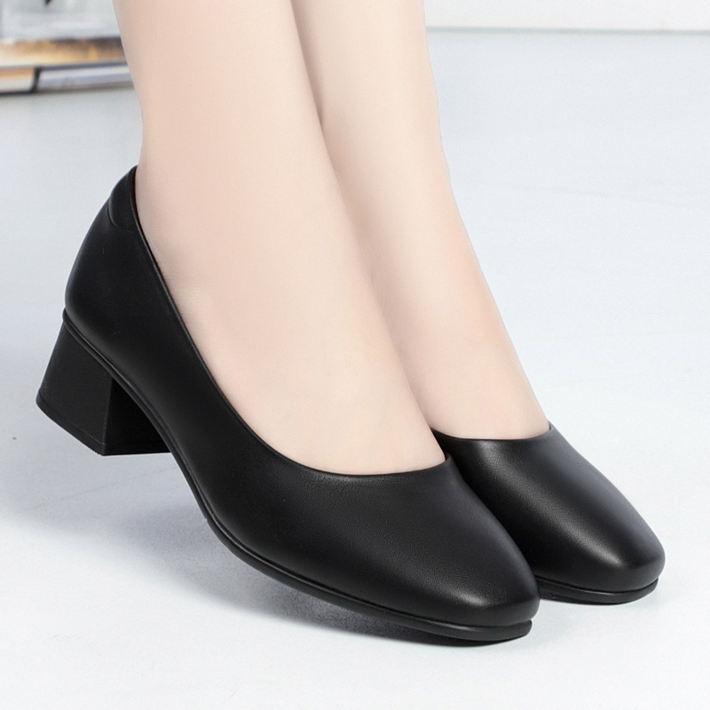 春と秋の新型の浅い口の先の本革の柔らかい底の百合の太いハイヒールの1字のバックルのお母さんの靴の作業靴の女性